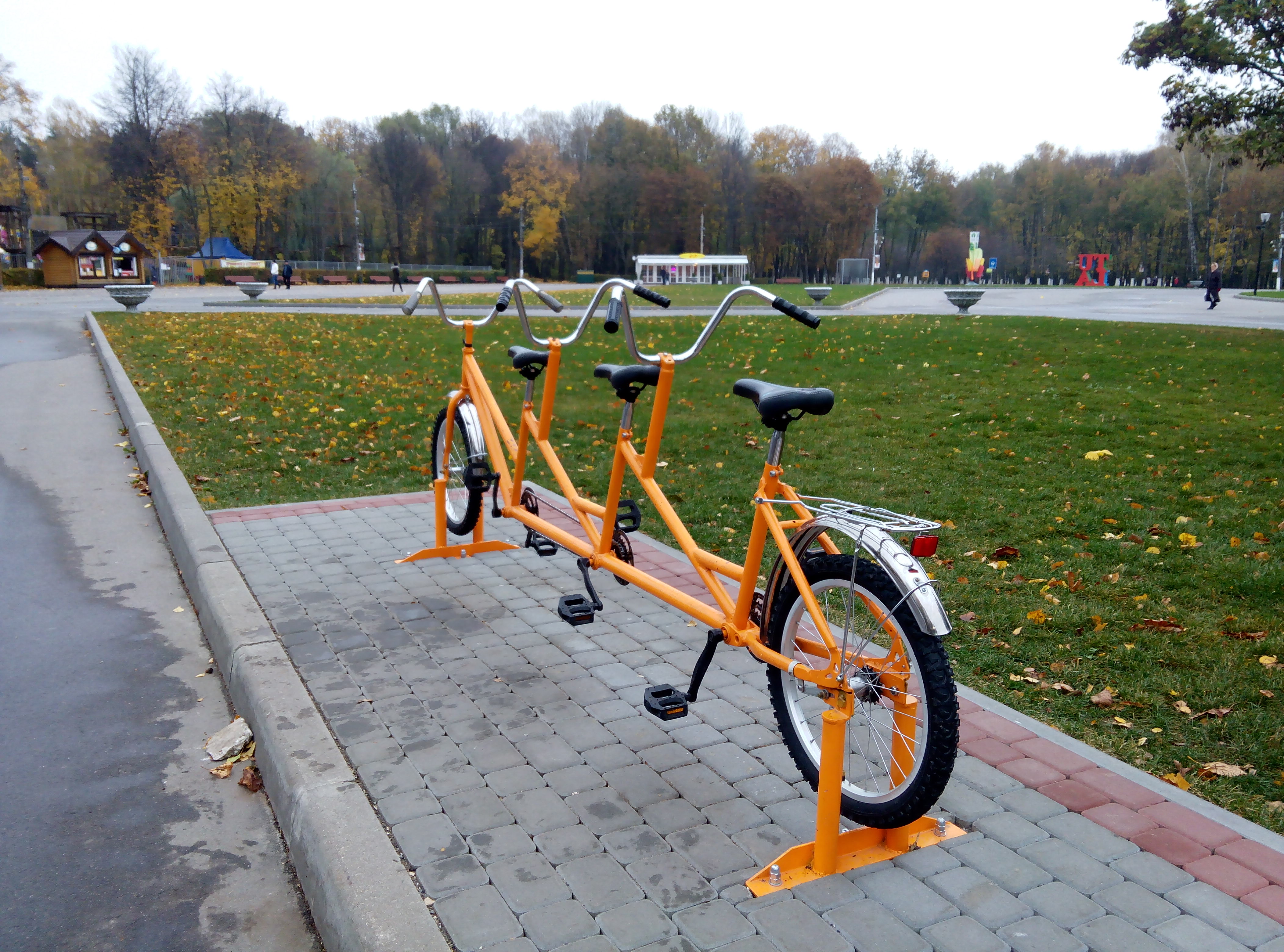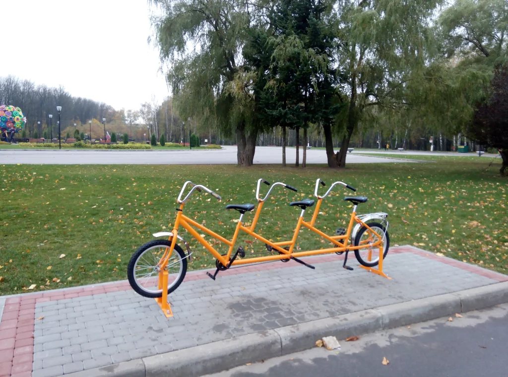 Оранжевый велосипед-тандем установили в Белоусовском парке возле центральной клумбы. Именно здесь часто собираются велосипедисты, скейтеры, роллеры и прочие любители покатушек. Велик вполне реальный - с колесами, педалями, сиденьями – все как положено. Однако далеко на нем не уедешь, так как он намертво прикручен к земле. Арт-объект все-таки. А вот потренировать ягодичные мышцы очень даже можно.