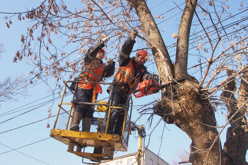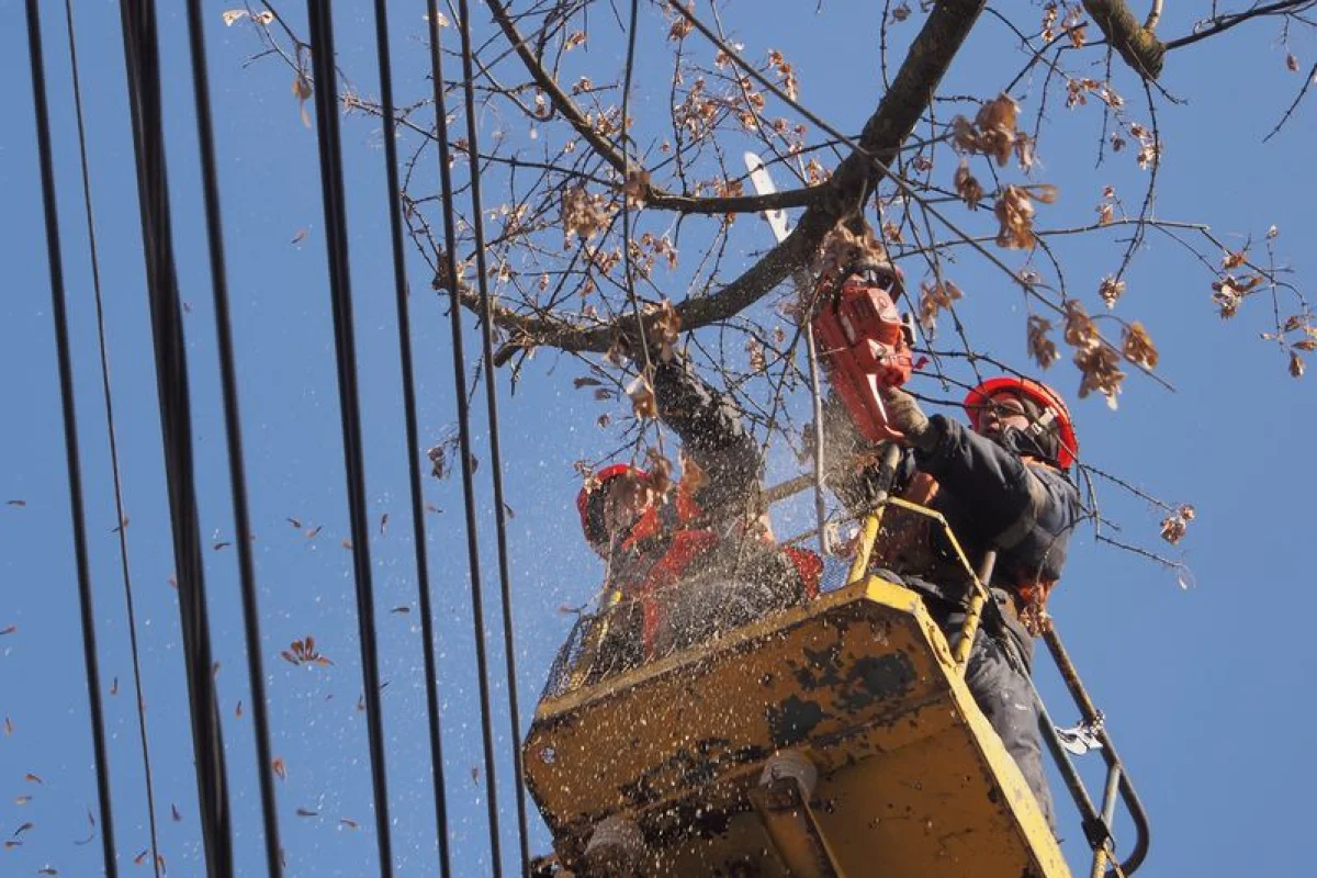 Благоустройство Зареченского округа продолжается. Так на пересечении ул. Октябрьской и ул. Пузакова производится кронирование аварийных деревьев.