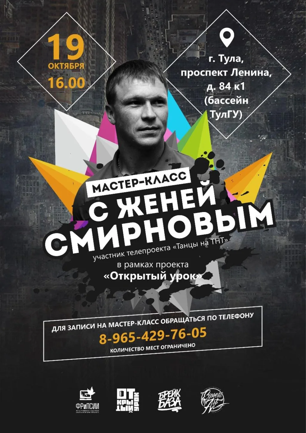 19 октября 2016 года в Туле пройдёт мастер-класс по брейк-дансу с участником проекта «Танцы на ТНТ» Женей (Рыжим) Смирновым. Организатором выступает Фонд развития и поддержки социальных интернет-инициатив (ФРиПСИИ) в сотрудничестве с тульской Школой брейк-данса «Брейк База» и Тульской региональной молодежной общественной организацией содействия развитию спорта и современного искусства «Экспресс-Арт». Занятие пройдёт в рамках проекта «Открытый урок», направленного на популяризацию инклюзивного обучения. Урок в Брянске станет уже шестым мероприятием проекта.