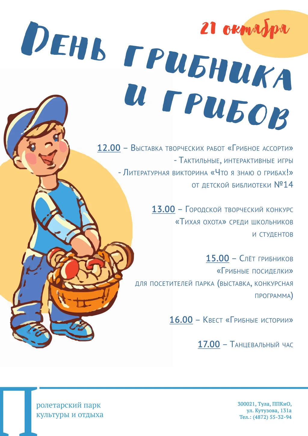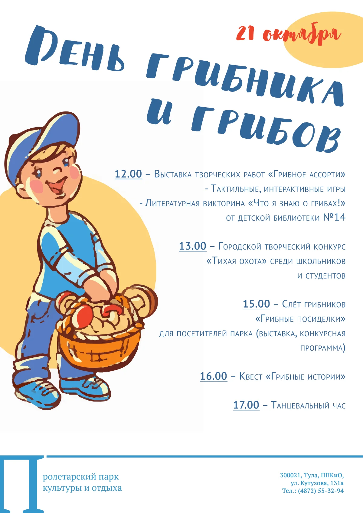 В пятницу, 21 октября, в Пролетарском парке состоится День грибника и грибов. Туляков ждет насыщенная празднисная программа: выставка творческих работ, интерактивные игры, грибные конкурсы, слет грибников, квест «Грибные истории» и даже танцевальный час.