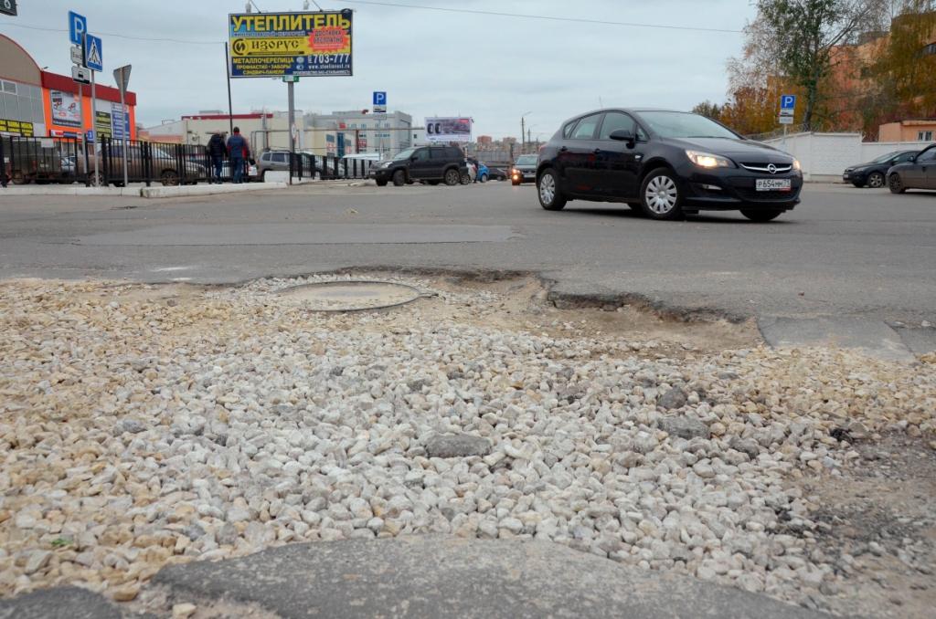 На перекрестке улиц Мосина и Фрунзе целое каменистое озеро! Яма тут довольно обширная, но ее замаскировали щебнем. А еще там есть вмятый в землю кривой люк. Будьте осторожны!