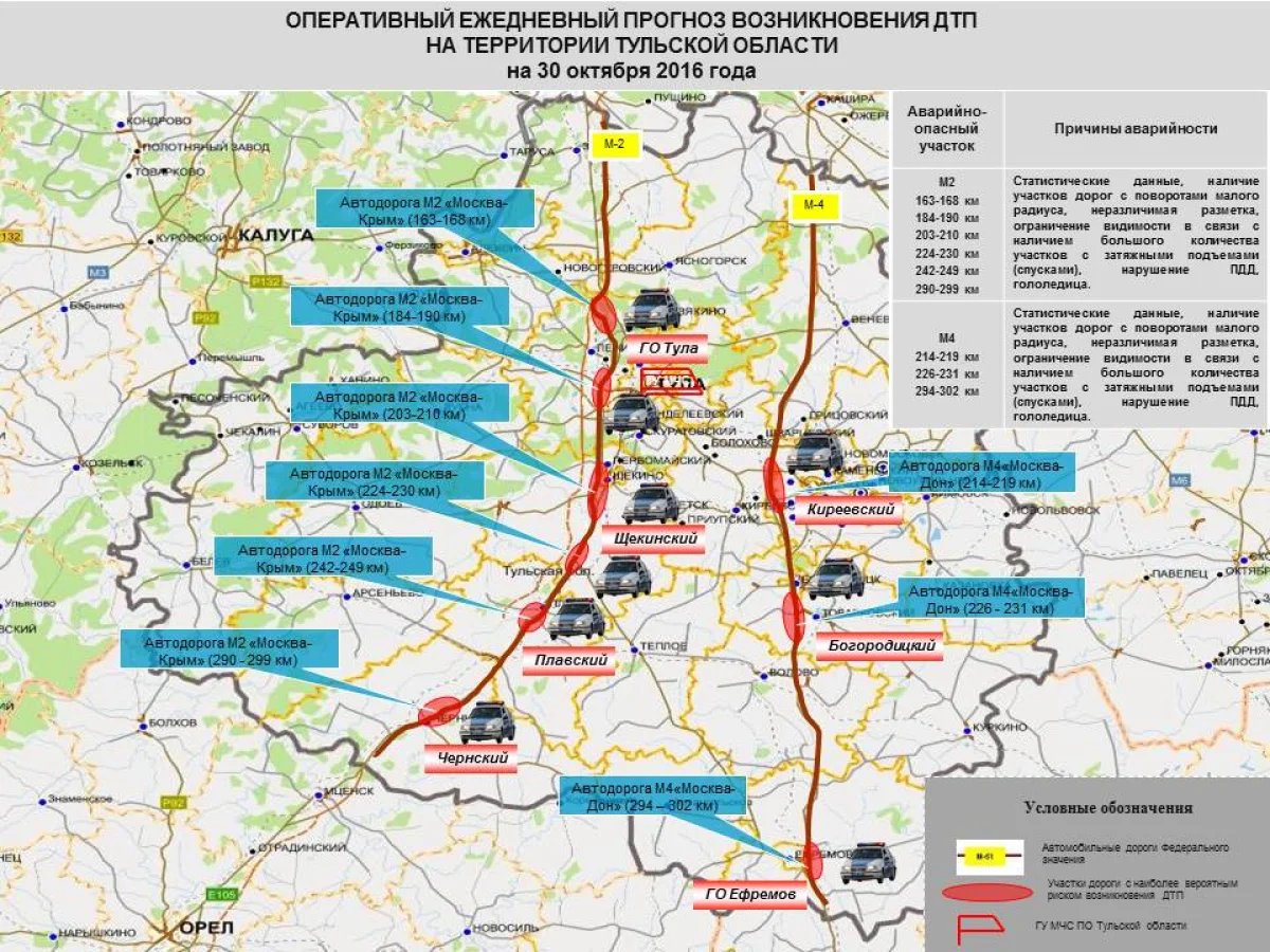 На территории области прогнозируется возникновение до 5-6 ДТП в Щекинском, Богородицком, Плавском, Чернском, Киреевском районах, ГО Ефремов, ГО Тула (с вероятностью 0,26) на автотрассах федерального значения: