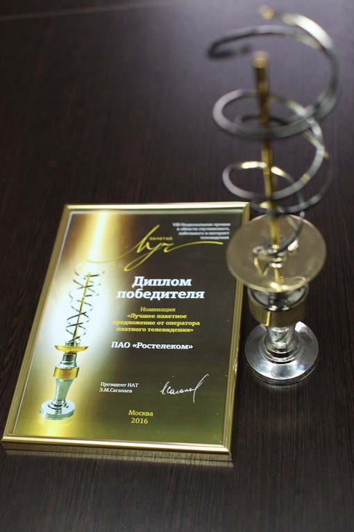 «Ростелеком» победил в номинации «Лучшее пакетное предложение от оператора платного ТВ» национальной премии в области спутникового, кабельного и интернет телевидения «Золотой луч». Торжественная церемония награждения состоялась 26 октября 2016 года в Москве.