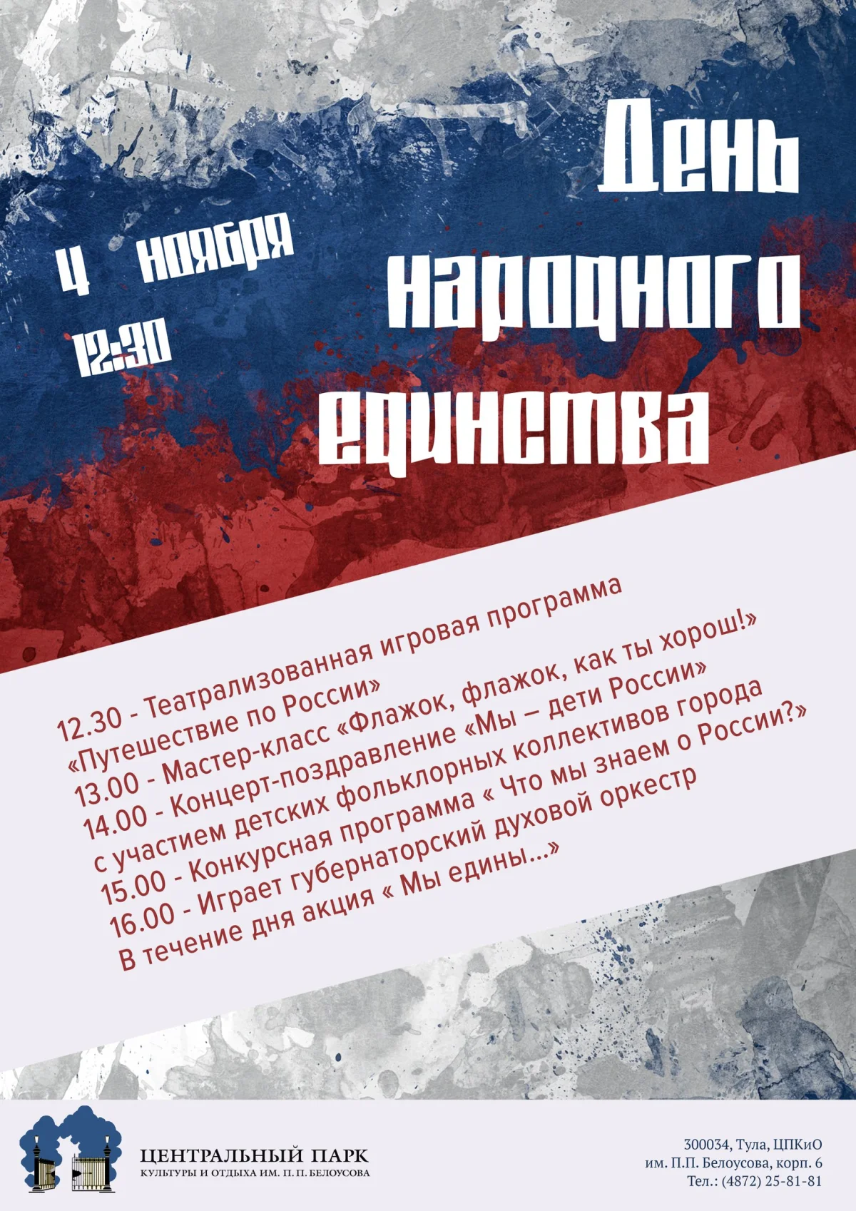 4 ноября Центральный парк Тулы приглашает отметить «День народного единства». Этот праздник установлен в честь важного для России события — освобождения Москвы от польских интервентов Мининым и Пожарским в 1612 году.