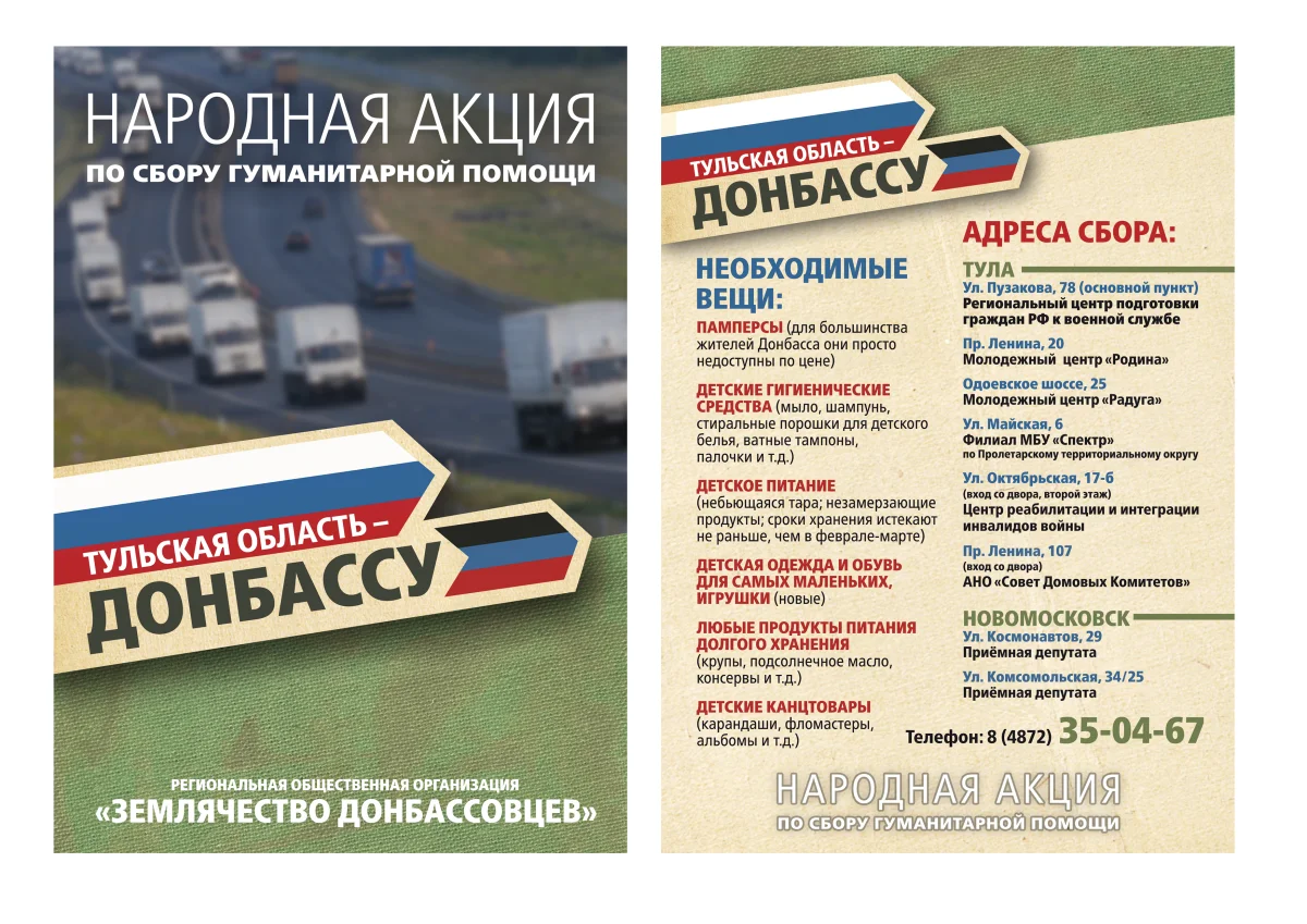 Туляков приглашают присоединиться к народной акции по сбору гуманитарной помощи для жителей Донбасса.