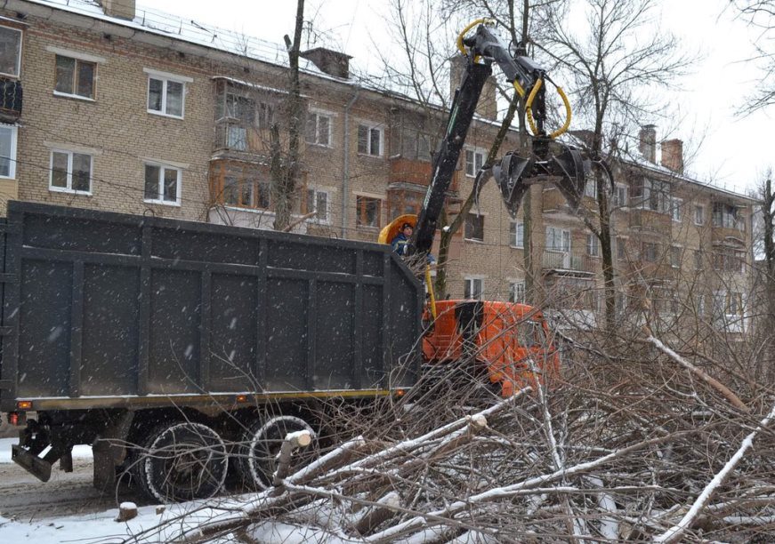 Так, на ул. Дементьева удаляют аварийные деревья и поросль, а также вывозят ветки.