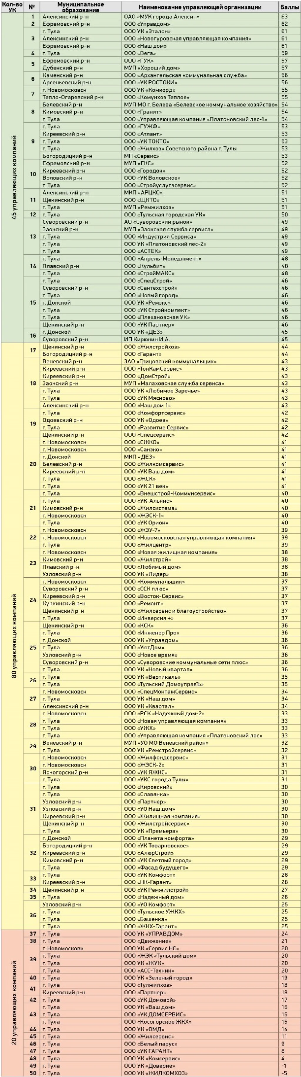 Составлен итоговый рейтинг управляющих компаний Тульской области