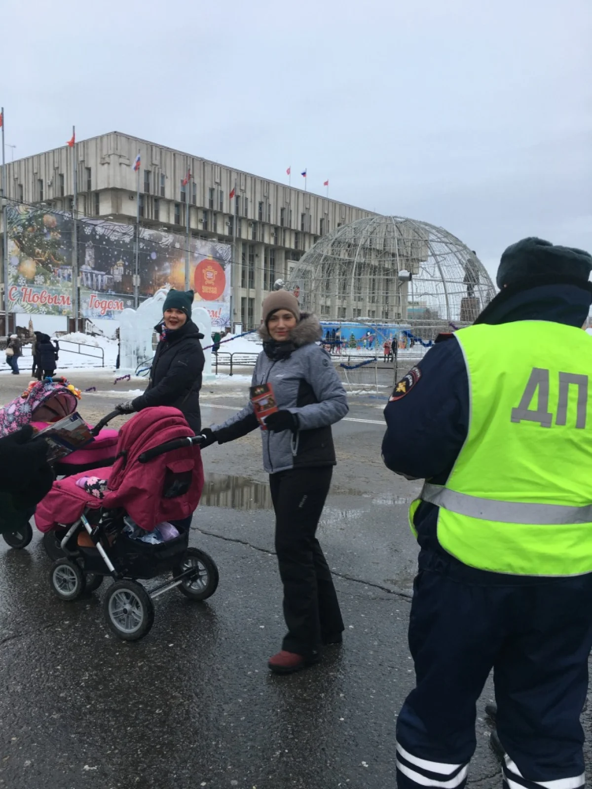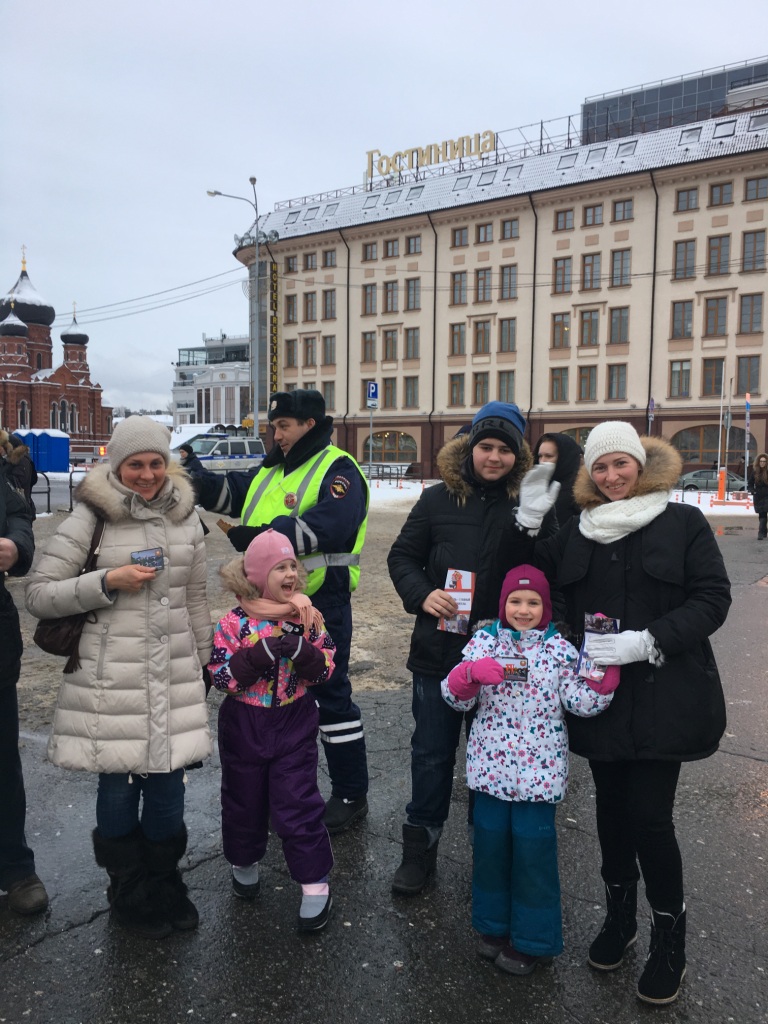 На главной елке города, что находится на площади Ленина, раздали пешеходам буклеты «Внимание каникулы!», «Родитель-главны