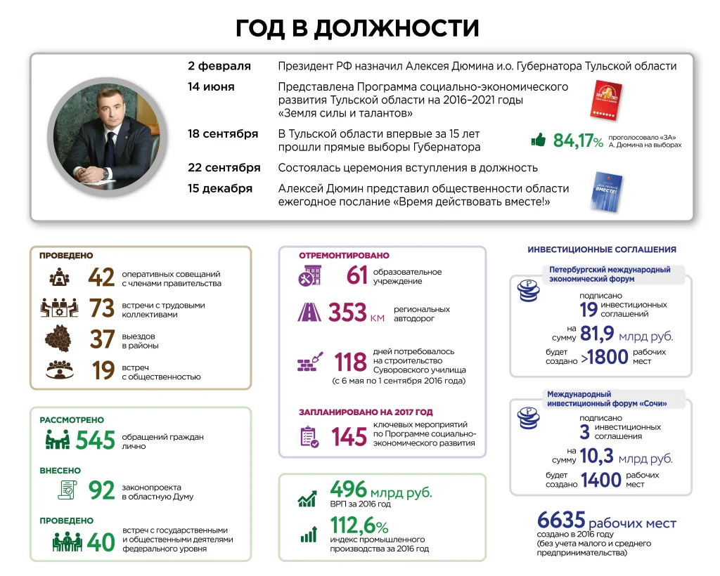 Президент РФ Владимир Путин назначил Алексея Дюмина временно исполняющим обязанности губернатора. За небольшой период времени Алексей Геннадьевич сумел заслужить уважение туляков, и 18 сентября 2016 года одержал на губернаторских выборах уверенную победу. За него отдали свои голоса почти 85% жителей Тулы и области.