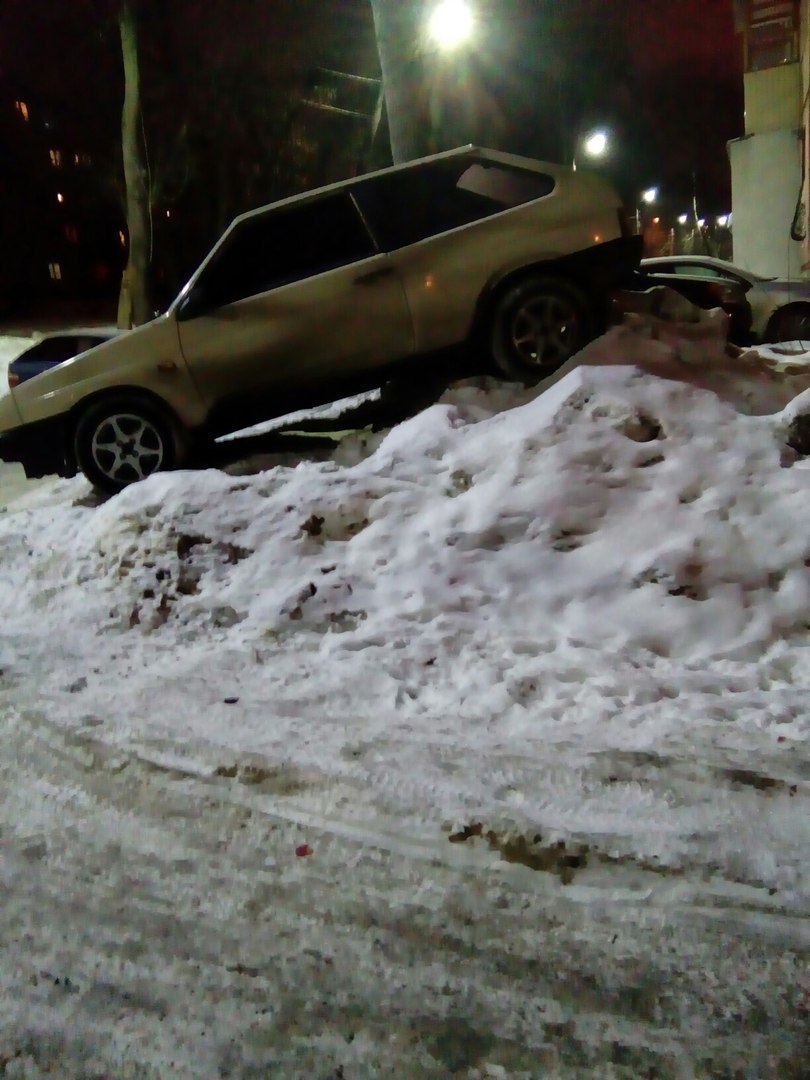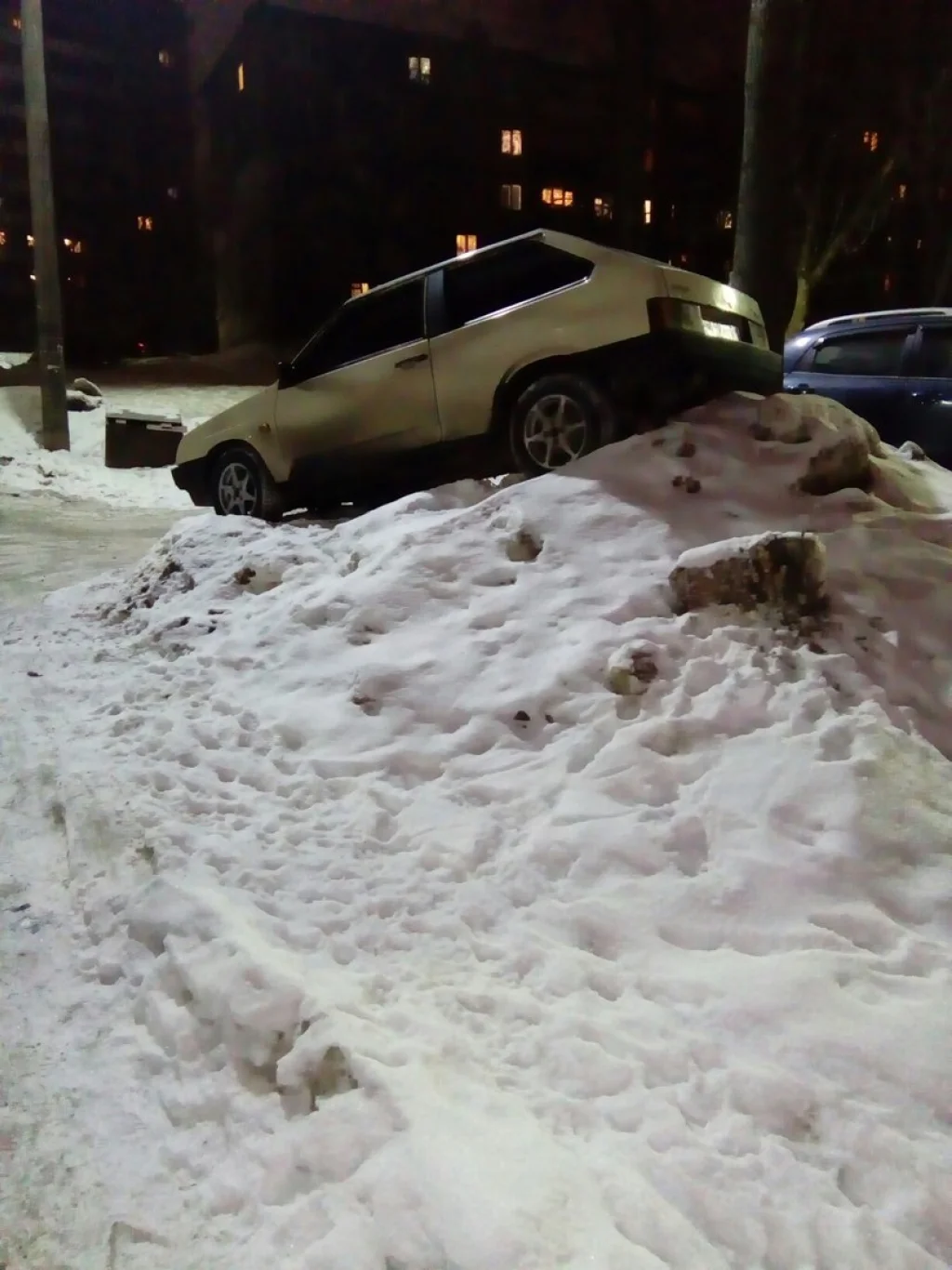 Царь горы: в Туле водитель «девятки» припарковал машину на вершине сугроба