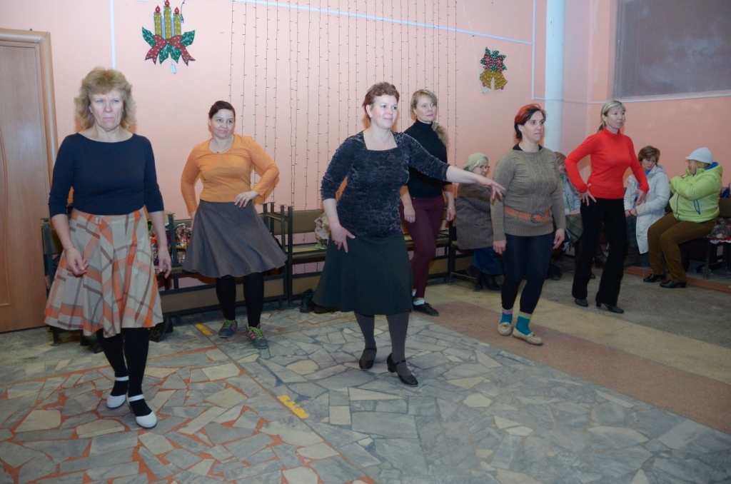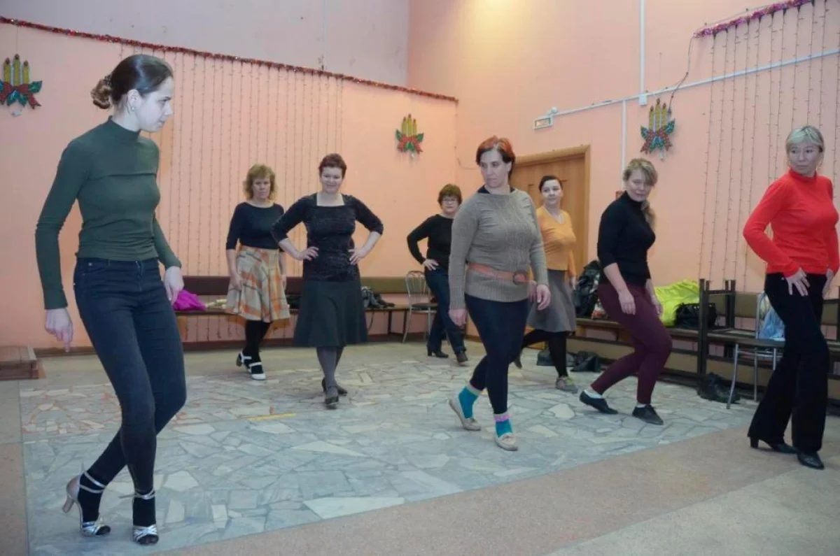 Наверху в актовом зале – два подвесных обогревателя. На стенах гирлянды. Пол дощатый. Когда мы пришли туда, в разгаре было занятие по танцам. По залу раздавался стук каблучков, шелест юбок и голос преподавателя танцев: «ча-ча-раз-два-три…» и сначала.