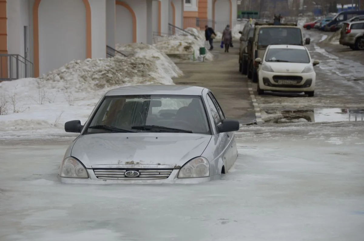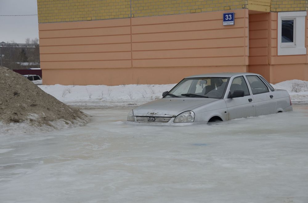 Машина оказалась в западне из-за коммунальной аварии. На ул. Хворостухина, где припаркован автомобиль, прорвало трубу. Водитель не успел переставить транспортное средство, и ударившие морозы намертво сковали «Приору».