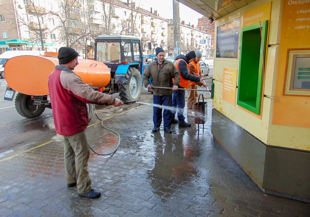 В субботу, 4 марта работники депо и автобусного парка муниципального транспортного предприятия под руководством директора Валерия Симаковича приняли участие в работах по очистке остановочных павильонов.