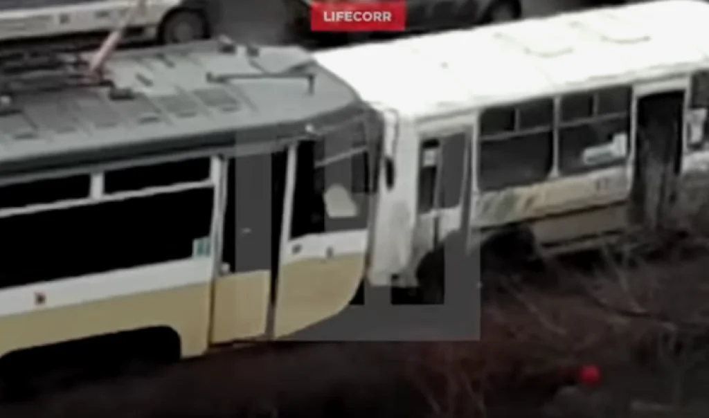 В Туле трамвай вытолкнул застрявший на путях пазик