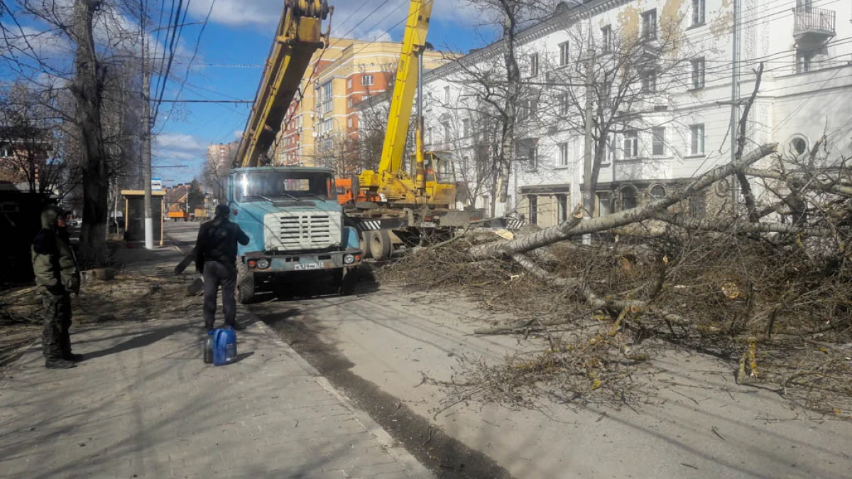 Специалисты подрядной организации удаляли аварийные тополя на улице Первомайской (на участке между улицами Дмитрия Ульянова и Вересаева).