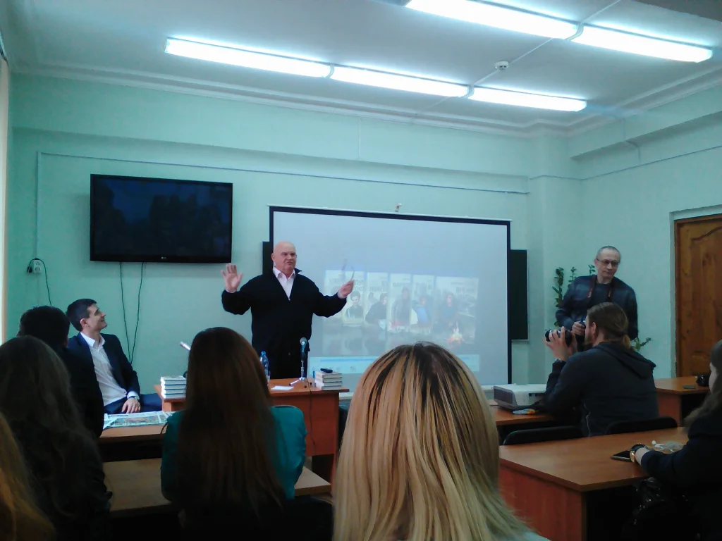 Далее студенты задавали свои вопросы . Главное, что попытлся донести до своих собеседников – человека интересуют личности. Затем каждому студенту досталась новая книга с автографом.
