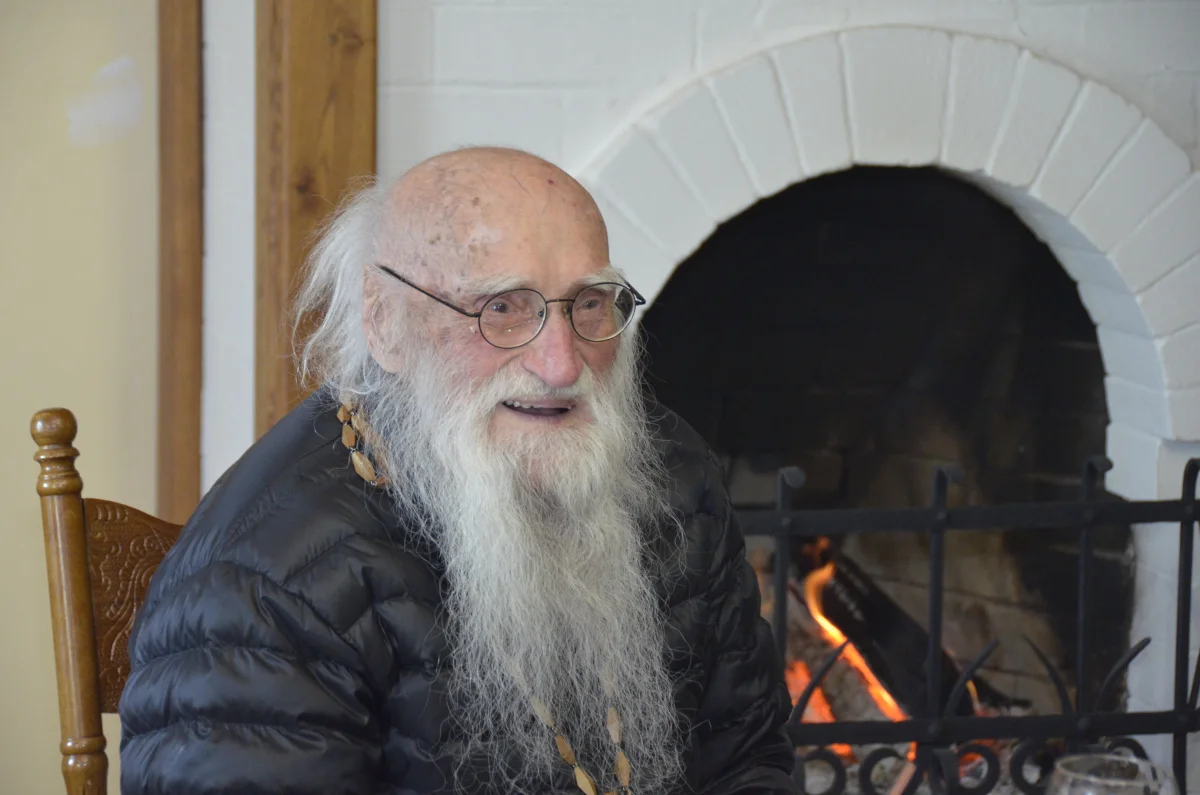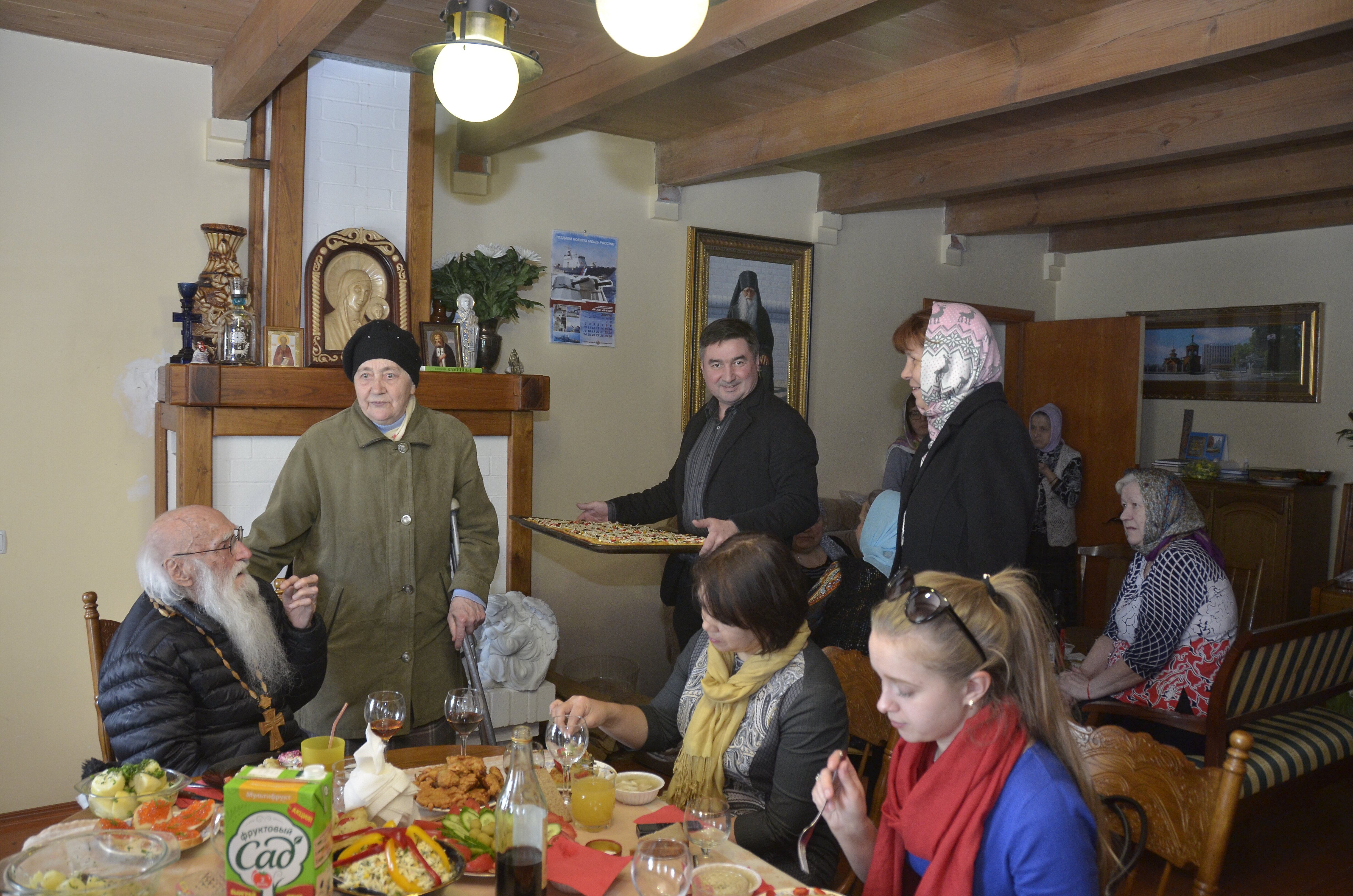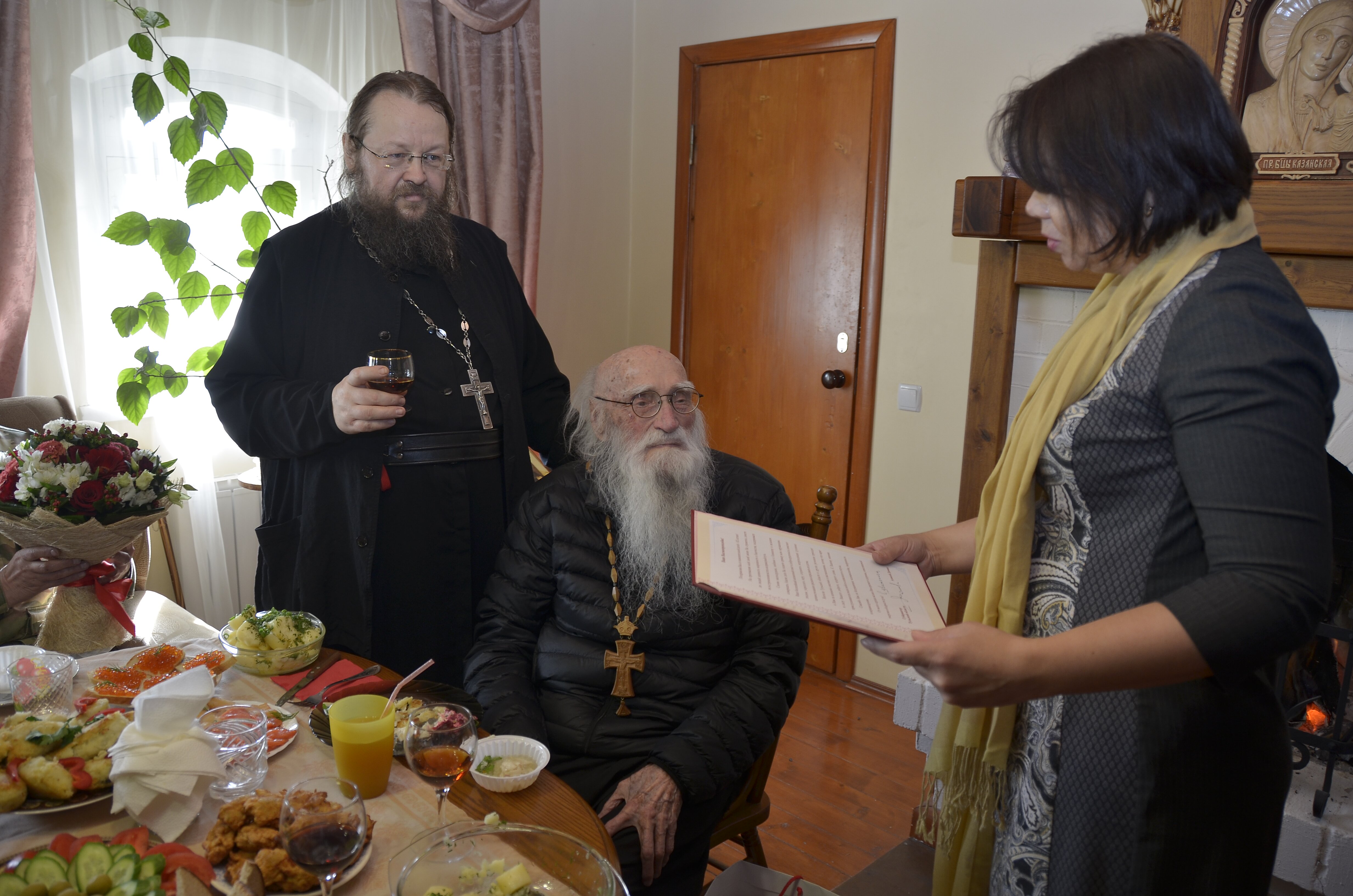 Отец Анастасий в свой день рождения выглядит бодро, весело. Расположившись за столом у камина, в котором тлеют поленья, старец благословляет, дает напутствие, благодарит всех пришедших поздравить его. Гости поднимают за него бокалы и благодарят Бога за то, что подарил им возможность познакомиться с отцом Анастасием. Старец же скромно попивает сок из бокала через трубочку, улыбается и рассказывает: