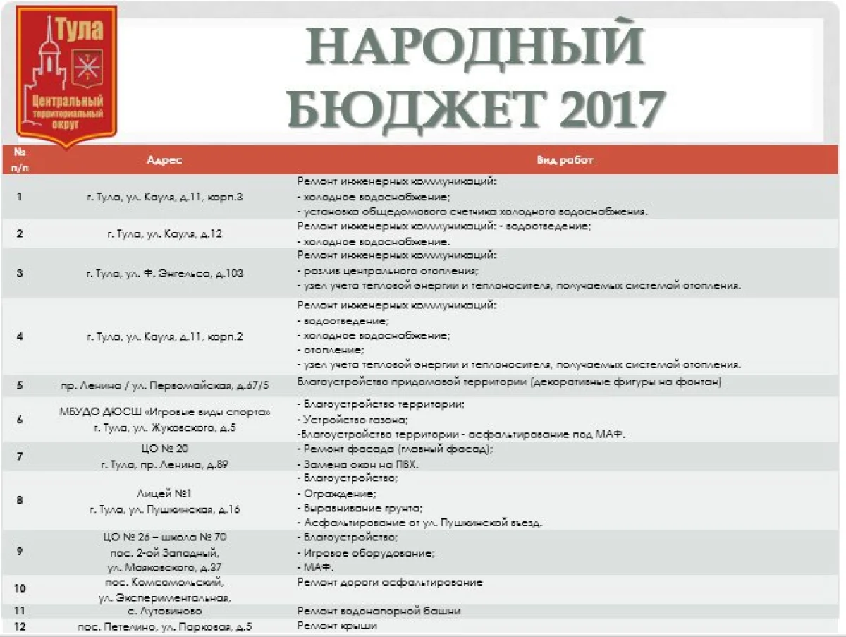 По программе «Народный бюджет» в текущем году в Туле будут реализованы 12 проектов, сообщается в твиттере областного правительства: