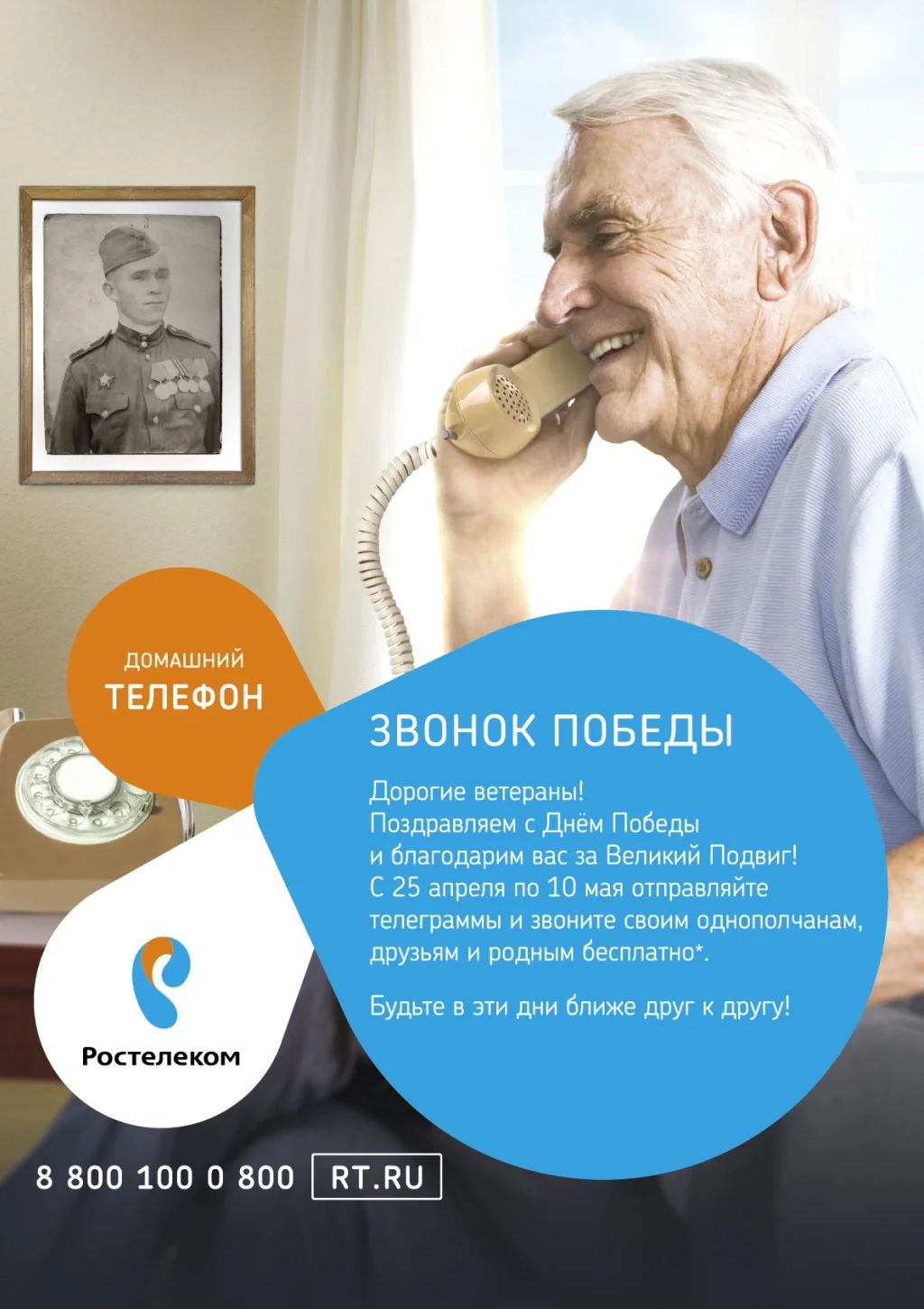 В честь Дня Победы «Ростелеком» традиционно дарит ветеранам и инвалидам Великой Отечественной войны возможность бесплатно пообщаться с однополчанами, родными и близкими в других городах России и ближнего зарубежья.
