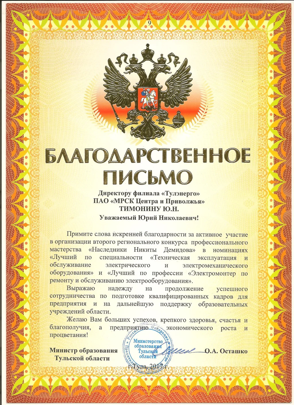 В адрес руководителя тульского филиала ПАО «МРСК Центра и Приволжья» Юрия Тимонина поступило письмо министра образования Тульской области Оксаны Осташко с благодарностью за активное участие работников филиала в организации практического этапа регионального конкурса профессионального мастерства «Наследники Никиты Демидова» среди студентов.