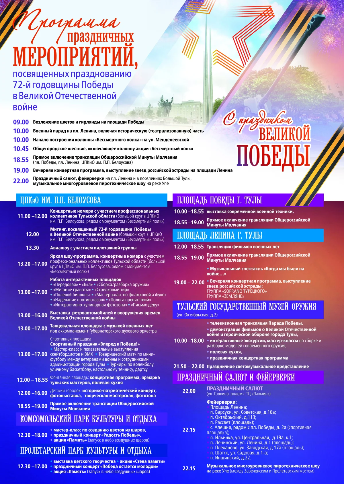 В День Победы 9 мая туляков ждёт огромное количество праздничных мероприятий: парад, шествие «Бессмертного полка», авиашоу, тематические площадки, концерты, игры, квесты и, конечно же, салют. Полную афишу смотрите ЗДЕСЬ.