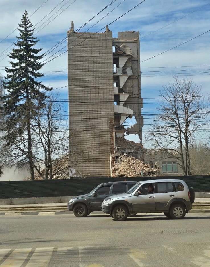 В Туле завершили снос 12-этажного здания бывшей «Типографии» на улице Фридриха Энгельса. Вчера, 16 апреля, сооружение пало под натиском спецтехники.