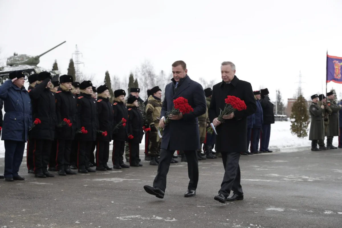 Утром Александр Беглов и Алексей Дюмин возложили цветы к памятнику Боевой Славы «Курган Бессмертия» в Ефремове, почтили память погибших в годы Великой Отечественной войны минутой молчания.
