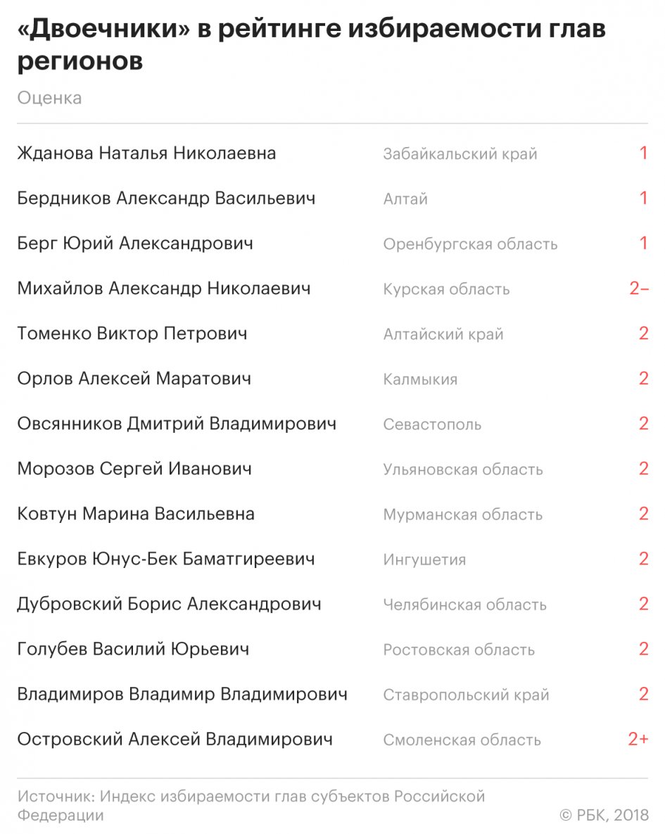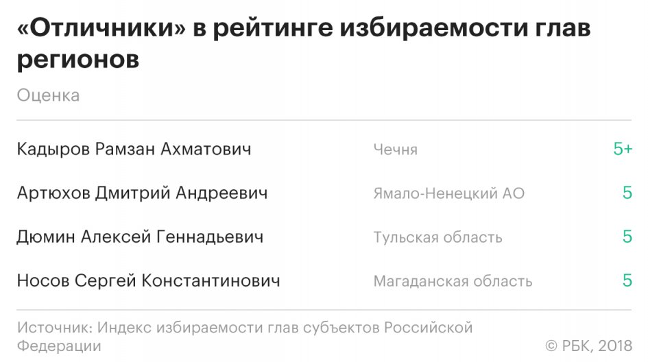 Индекс выводится на основе средней оценки. Таким образом, пятерки получили губернаторы, чье переизбрание гарантировано,