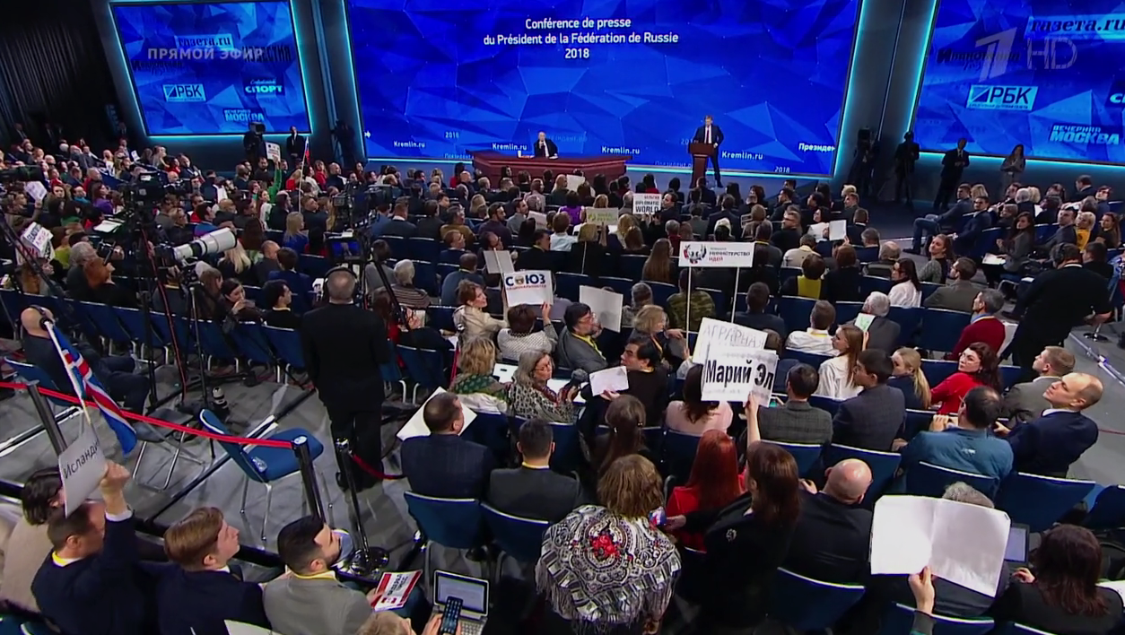 Пресс-секретарь президента Дмитрий Песков пытался намекнуть, что, мол, «уже три часа сидим». Но Путин начал сам выбирать журналистов: «Вот там есть табличка Урал». Кажется, это не закончится никогда. Сыпятся вопросы про патриотизм, про качество труб и воды. Путин согласен, что проблемы существуют.