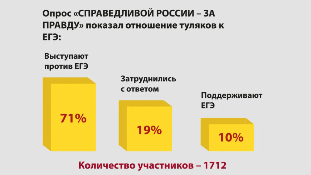 Кроме того, Александр Бычков напомнил, что и туляки поддержали инициативу «СПРАВЕДЛИВОЙ РОССИИ – ЗА ПРАВДУ» об отмене ЕГЭ. Недавний опрос партии показал, что 71% жителей региона настаивают на возвращении к традиционной форме проверки знаний. Всего в опросе оппозиционной партии поучаствовали более 1700 человек.