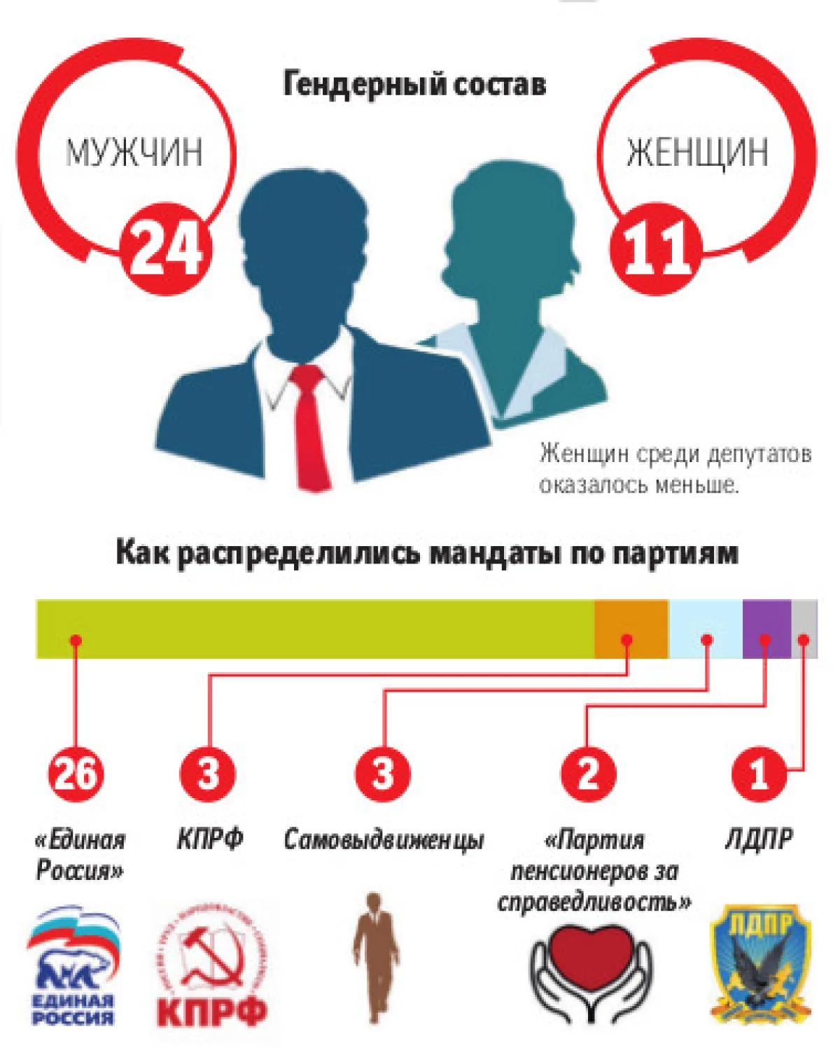 Как распределились мандаты по партиям 26 - «ЕДИНАЯ РОССИЯ», 2 - «Партия пенсионеров за справедливость», 3 - КПРФ, 1 - ЛДПР, 3 - самовыдвиженцы.