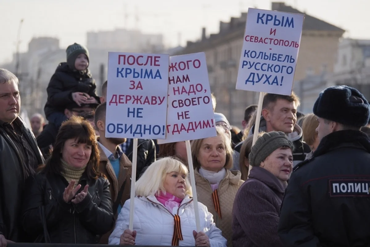 . Пришедшие отметить годовщину воссоединения полуострова с Россией, заняли всю площадь Ленина, в центре которой был развернут огромный российский триколор.