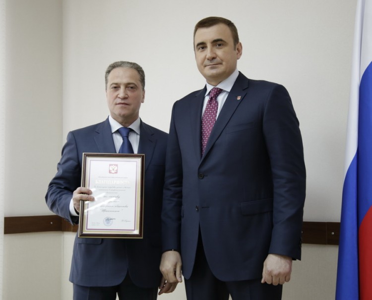 Затем Врио Губернатора Тульской области Алексей Дюмин вручил президенту ОАО «Щекиноазот» Борису Соколу за достигнутые трудовые успехи, многолетнюю добросовестную работу Почетную грамоту Президента Российской Федерации.
