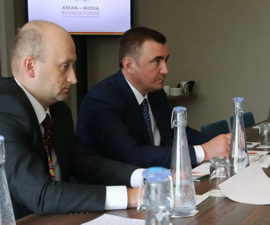 19 мая в рамках визита на Деловой форум Россия – АСЕАН врио губернатора Тульской области Алексей Дюмин провел ряд двусторонних встреч с представителями иностранных делегаций. В частности, он встретился с Президентом Тайско-Российской торговой палаты, старшим вице-президентом дочерней компании CP Group – CP Foods Сомбатом Тиратракунчай и вице-президентом CP Group Супакит Чераванон.