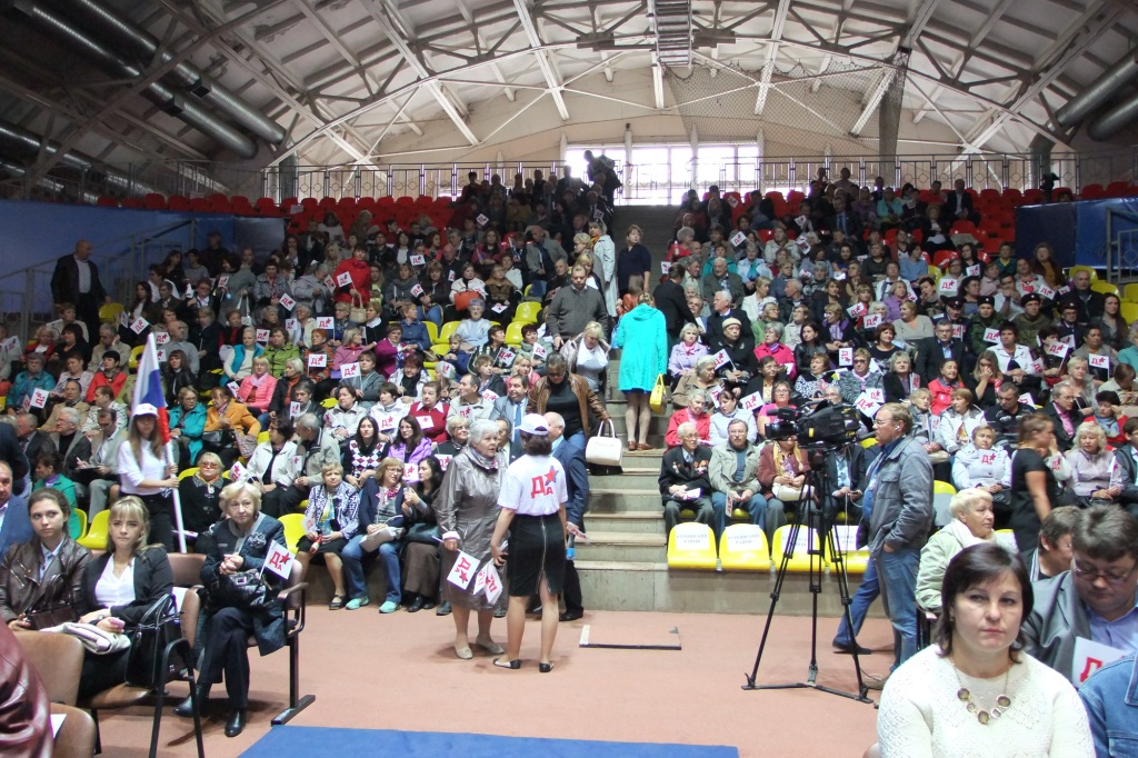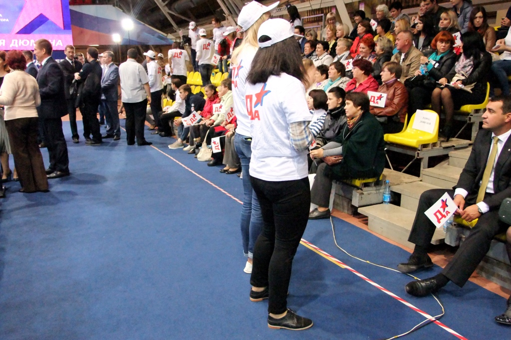 В Центральной арене стадиона «Арсенал» перед началом Форума народного доверия в поддержку Алексея Дюмина на пост Губернатора Тульской области была суета и волнение. Негромко играл джаз, люди рассаживались по местам, фотографировались, делали селфи, махали флажками с надписью «Да».