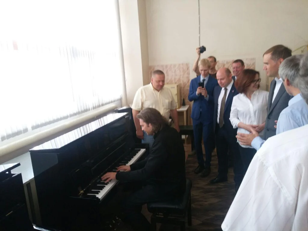 Певец сыграл на одном из 4 пианино, которые недавно собрали на предприятии.