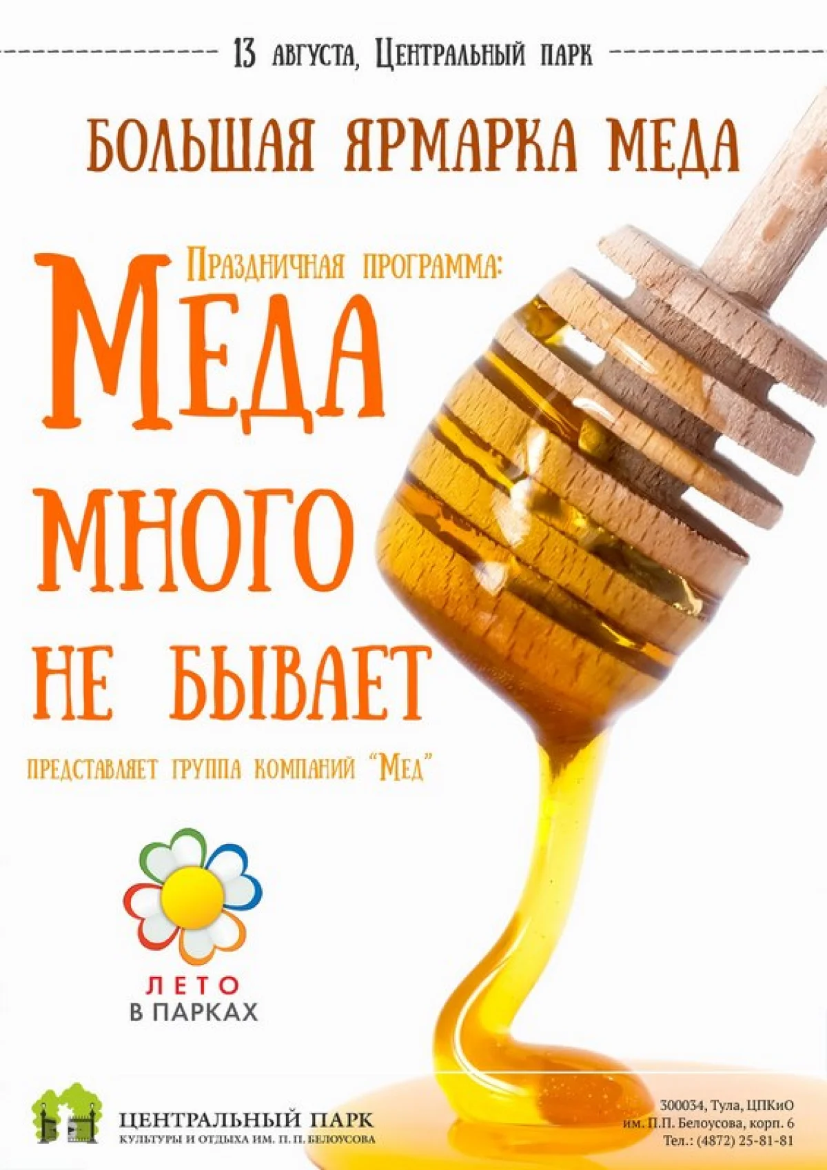 В воскресенье, 13 августа, в Центральном парке Тулы пройдёт большая ярмарка меда. Туляков ждёт концертно-развлекательная программа, и, конечно же, огромный ассортимент мёда от производителей региона.