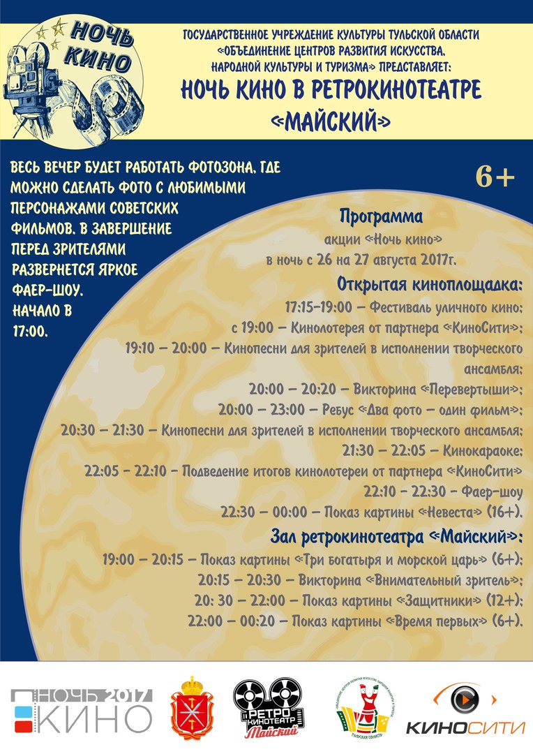 Всероссийская акция «Ночь кино» пройдёт с 26 по 27 августа почти на 2 тысячах площадок по всей стране. В Туле лучшие новинки кинематографа можно будет увидеть в ретро-кинотеатре «Майский» по адресу: ул. 9 Мая, 1А, 1Б. Начало в 17:00.