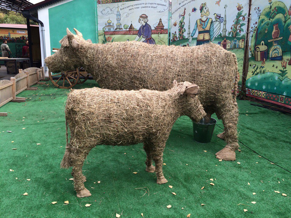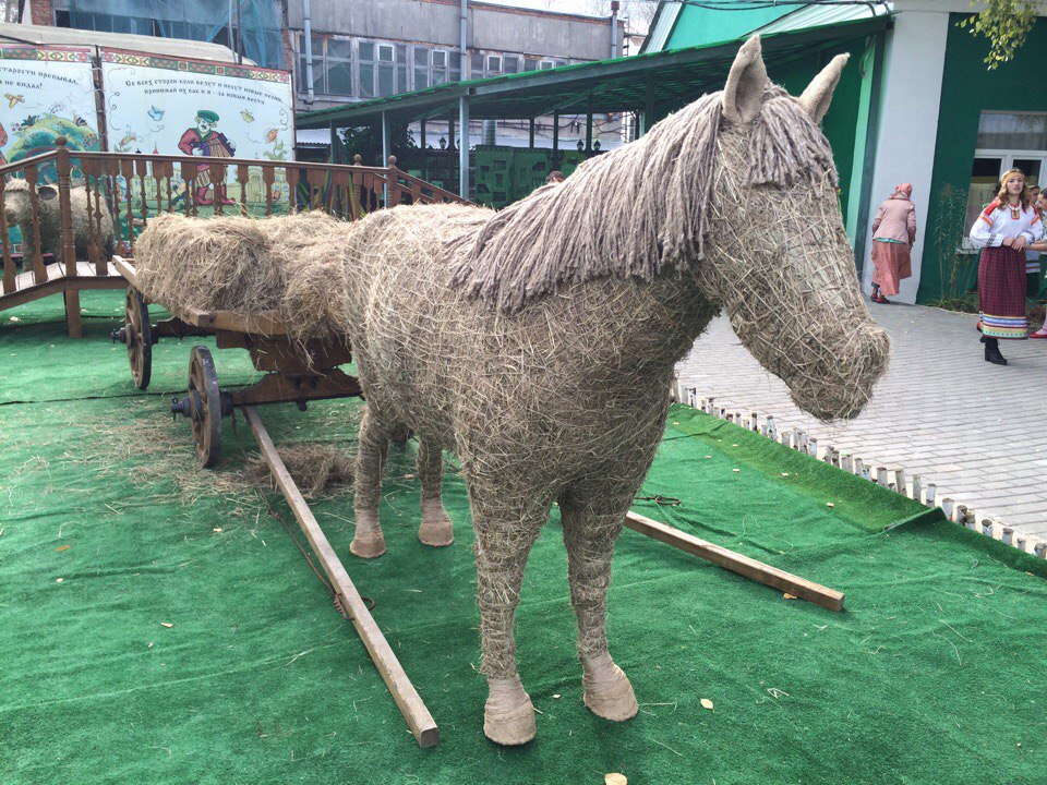 из коры подвешенные на крючки фигуры). Тот, кто уже сфотографировался с соломенными лошадьми и на лавке у резного