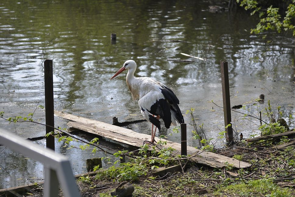 Рядом в пруду мерно вышагивают аисты. Зимой они тоже находились в закрытом теплом помещении и гуляли только в оттепель. Аисты немые, общаются выразительными позами, клекотом. Немного в стороне прогуливается аист по кличке Арно. Птице 8 лет. Он родился в естественных условиях с пороками крыльев и ног, поэтому был брошен родителями. Его подобрал и вырастил неравнодушный житель Тулы. Арно долго жил в квартире, очень привязался к хозяину, бегал за ним.