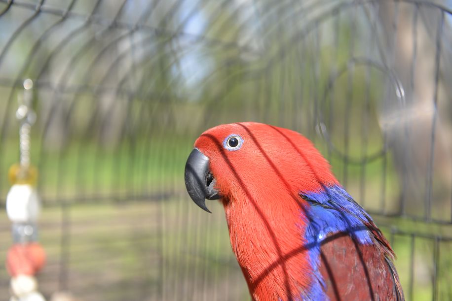 Окрас у самцов и самок эклектуса отличается. Первые выделяются своим травянисто-зеленым цветом. Самку легко отличить: у нее основным тоном оперения будет красный. На фоне своих шумных и подвижных попугаев, эклектусы отличаются более сдержанным нравом. Наиболее воспитанные особи и вовсе способны убирать за собой игрушки или рассыпанный корм.