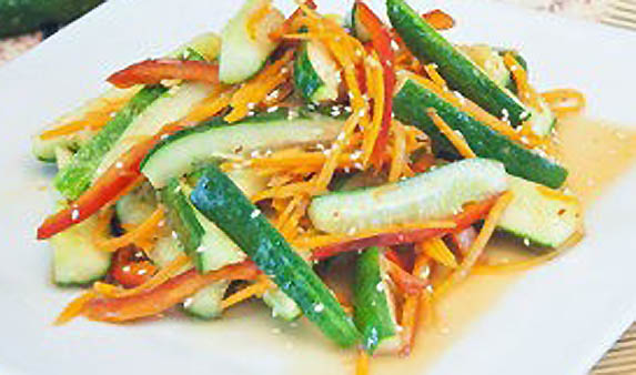 Потребуются: сладкий перец — 0,25 кг, белокочанная капуста (можно заменить китайской) — 0,3 кг, свежий огурец — 0,2 кг, стебли сельдерея — 100 г, лимон — 1 шт., растительное масло — по вкусу.