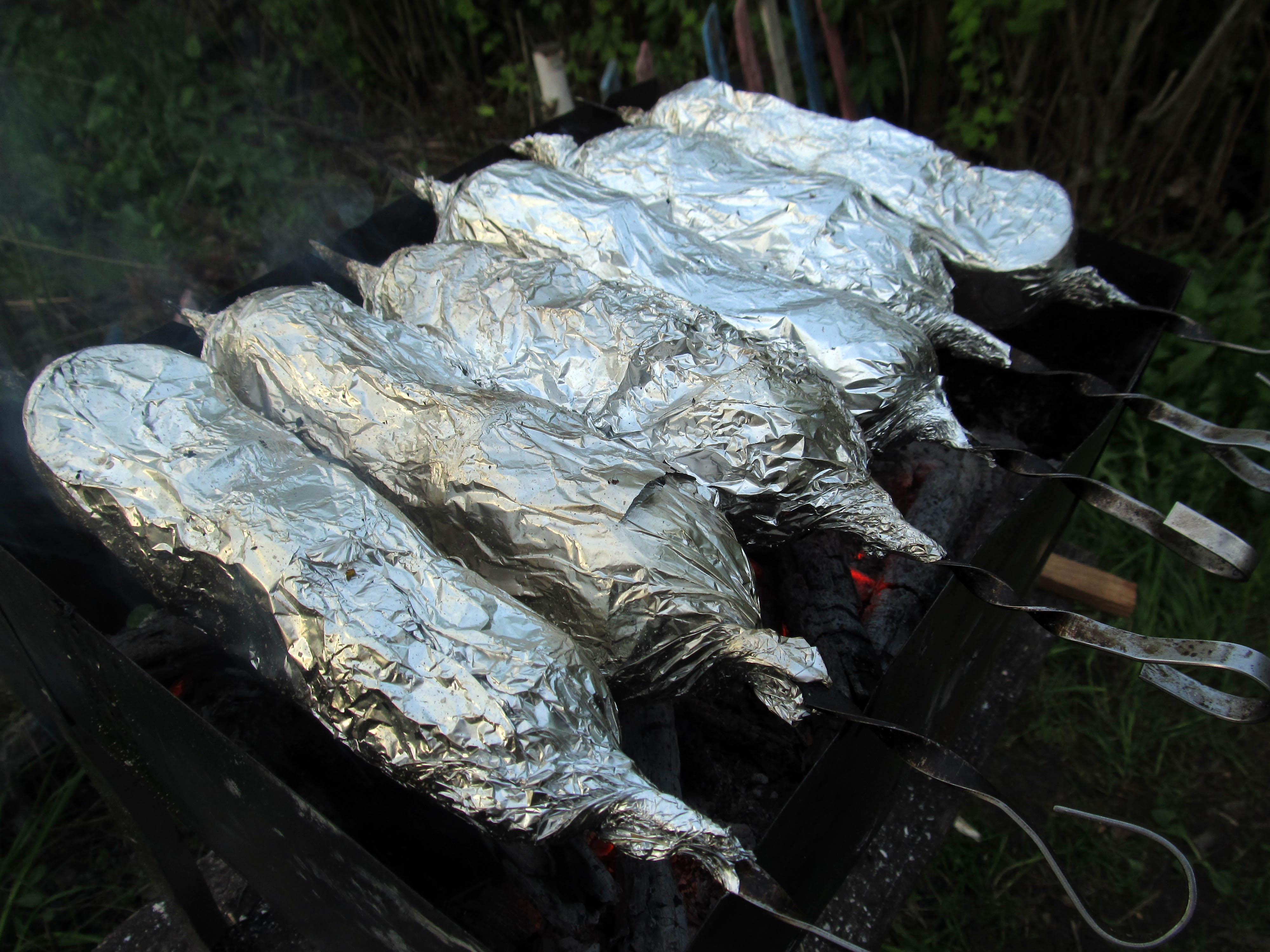 А это уже собственное изобретение автора сих строк. Родилось блюдо случайно — когда печальный неоднократный опыт показал, что на подостывших после жарки шашлыков углях приготовить еще и картофельный гарнир, насаженный на шампуры, не получается. Разводить же новый костер — не с руки.