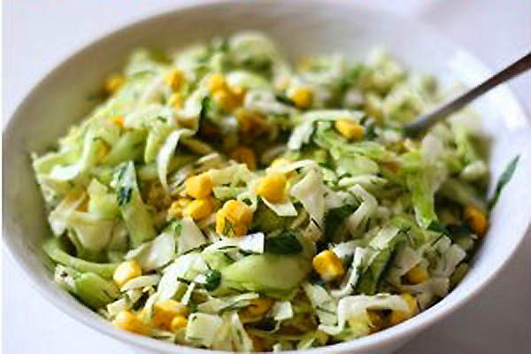 Нам потребуется 1 банка консервированной кукурузы, грамм 200 свежих огурчиков, небольшой вилок пекинской или белокочанной капусты, лимонный сок из половинки фрукта, 40-60 мл растительного масла, соль, перец — по вкусу.