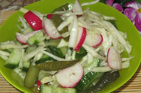 Все режем мелкими кубиками, зелень рубим, смешиваем, солим, добавляем щедро майонез. Получившийся «салат» заливаем холодной водой. Лишь теперь добавляем уксус. Тут уже дело вкуса — сколько.