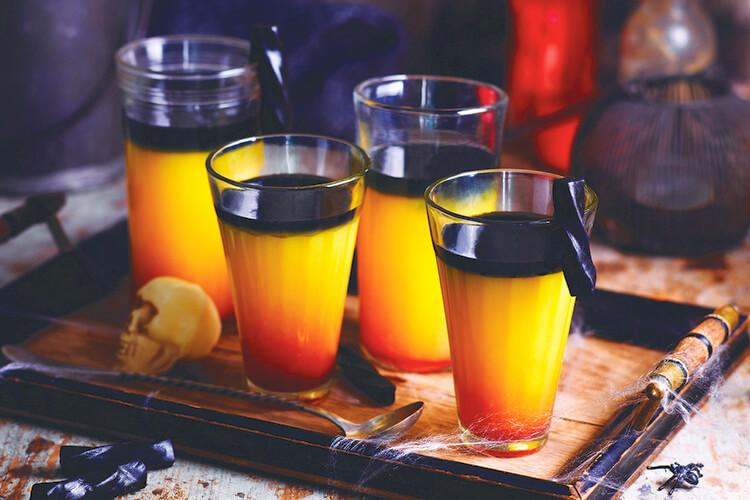 Высокий тонкий стакан (по типу «коллинз») наполнить льдом. Налить сок, а сверху аккуратно добавить настойку. Украсить черной трубочкой в тон и желейными паучками.