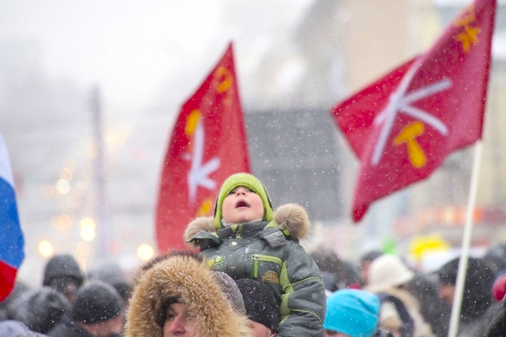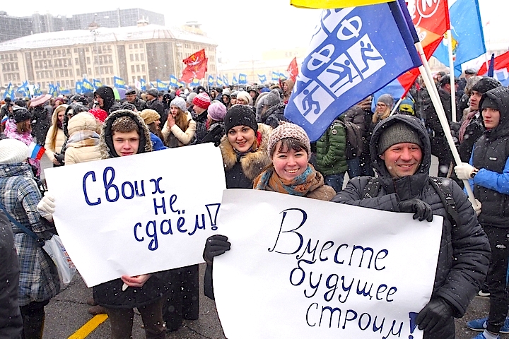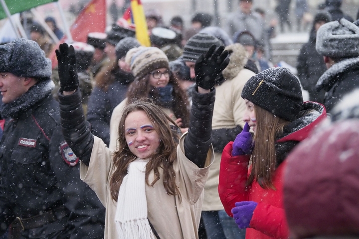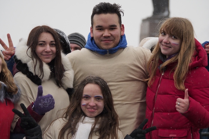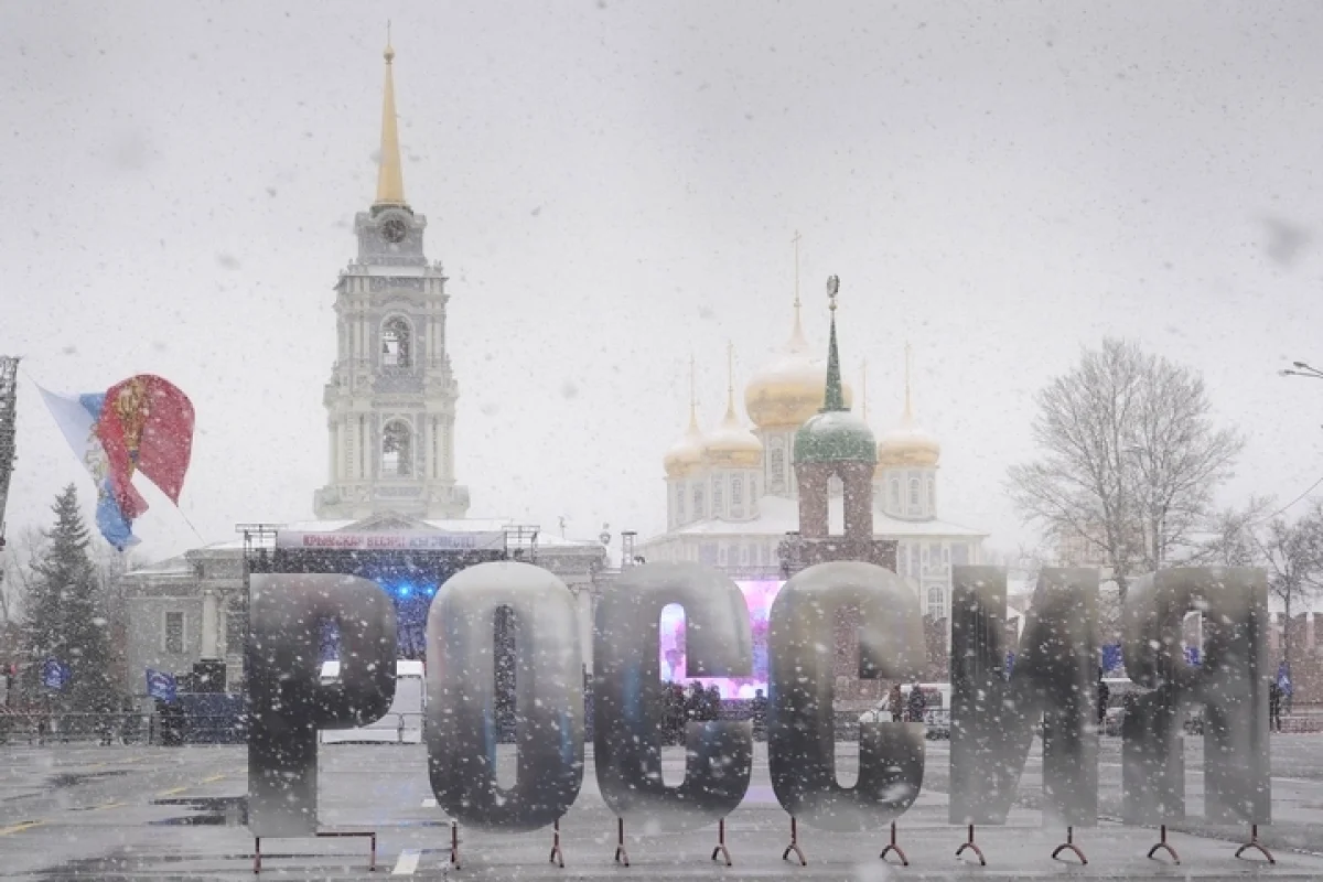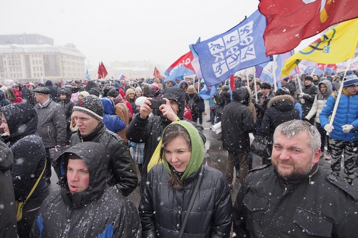 Снегопад и метель не помешали нескольким сотням туляков прийти на главную площадь города отметить два года со дня присоединения Крыма к России.