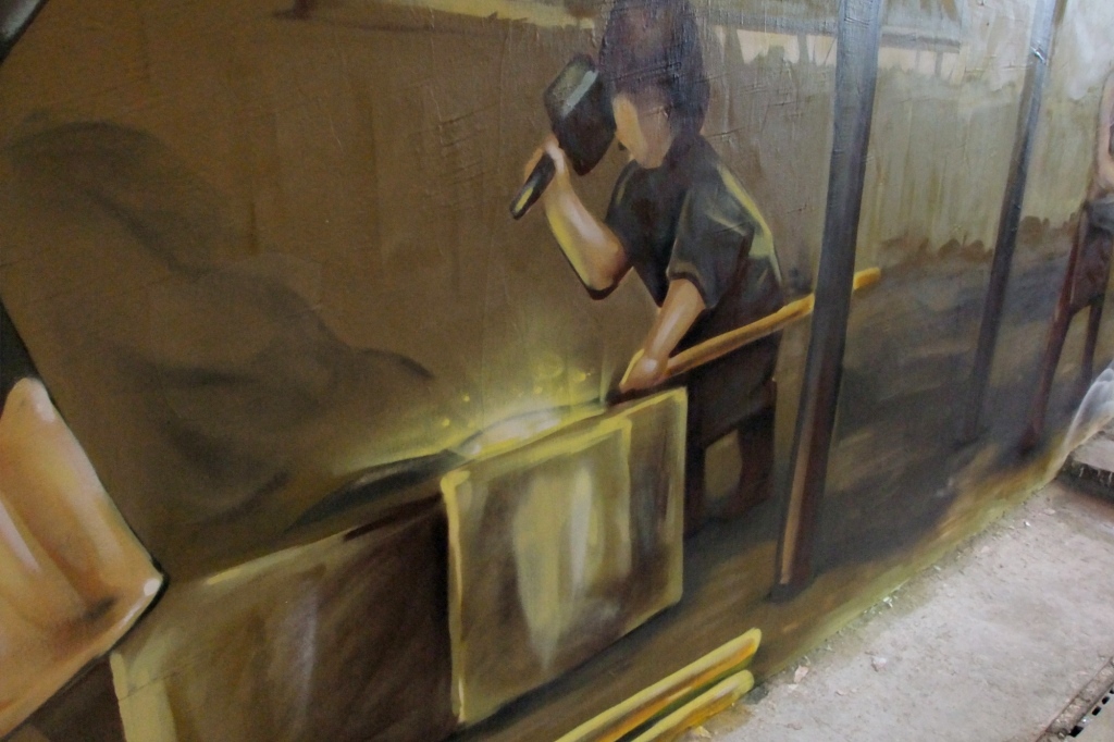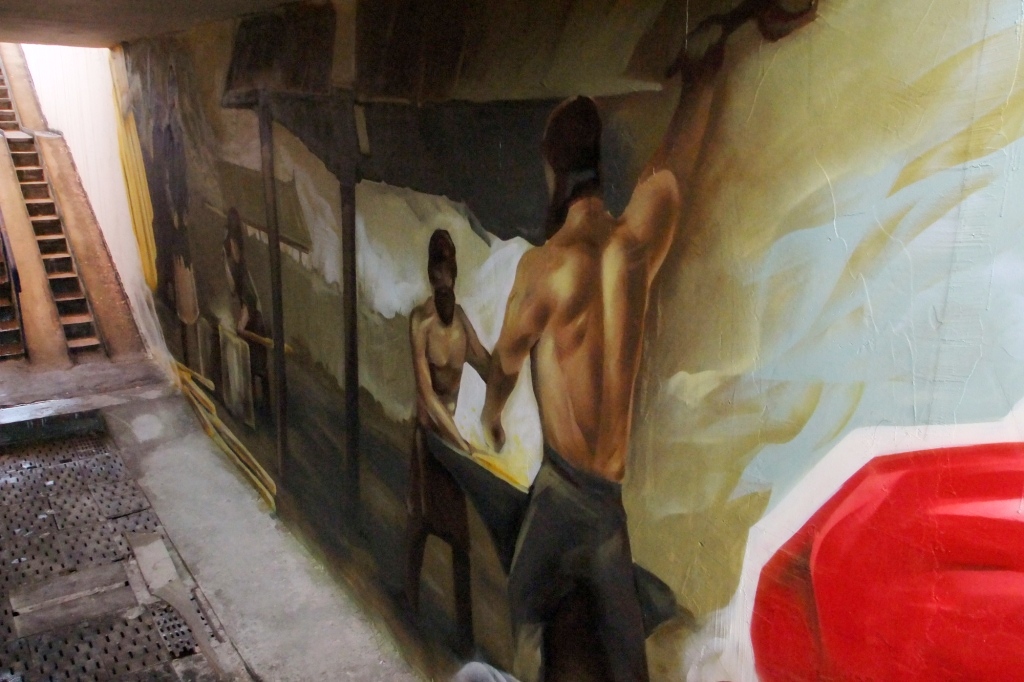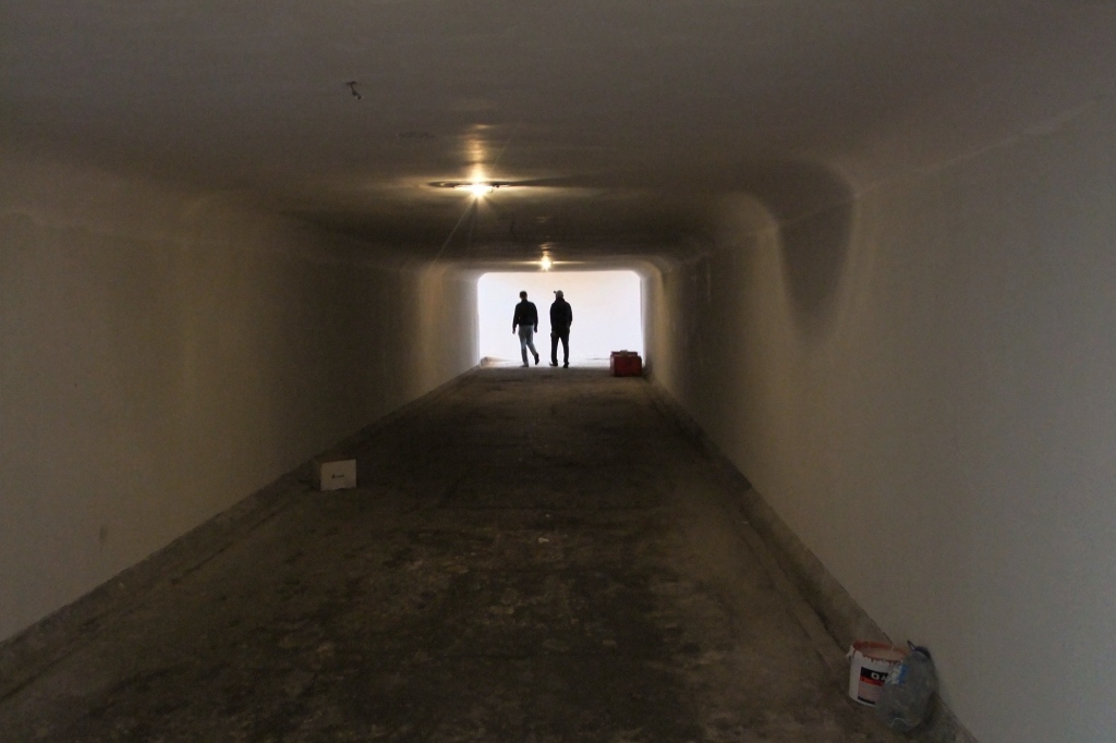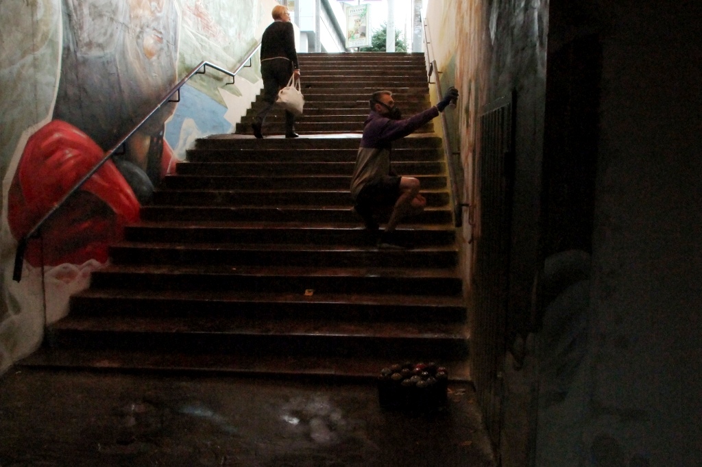 Большая часть перехода еще пустует, рисунки только начали появляться на стенах. Но где еще увидишь граффити-художника, рисующего средь бела дня в центре города? Только в Туле.