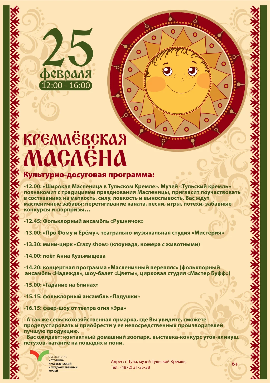 25 февраля с 12:00 до 17:00 в Тульском кремле пройдут праздничные гуляния «Кремлёвская Маслёна»!