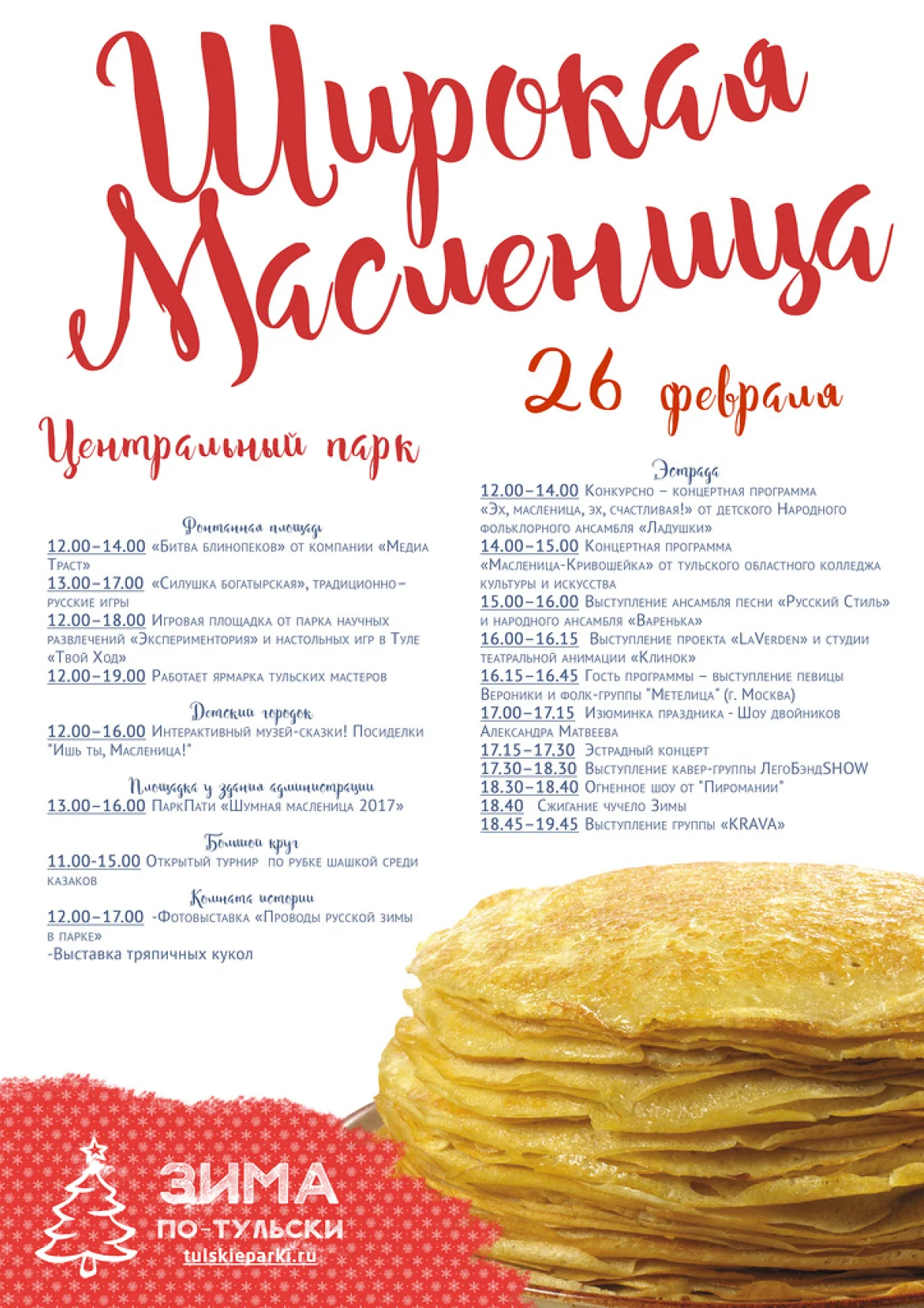 В Центральном парке туляков ждёт битва блинопеков, русские забавы и концерт. АФИША